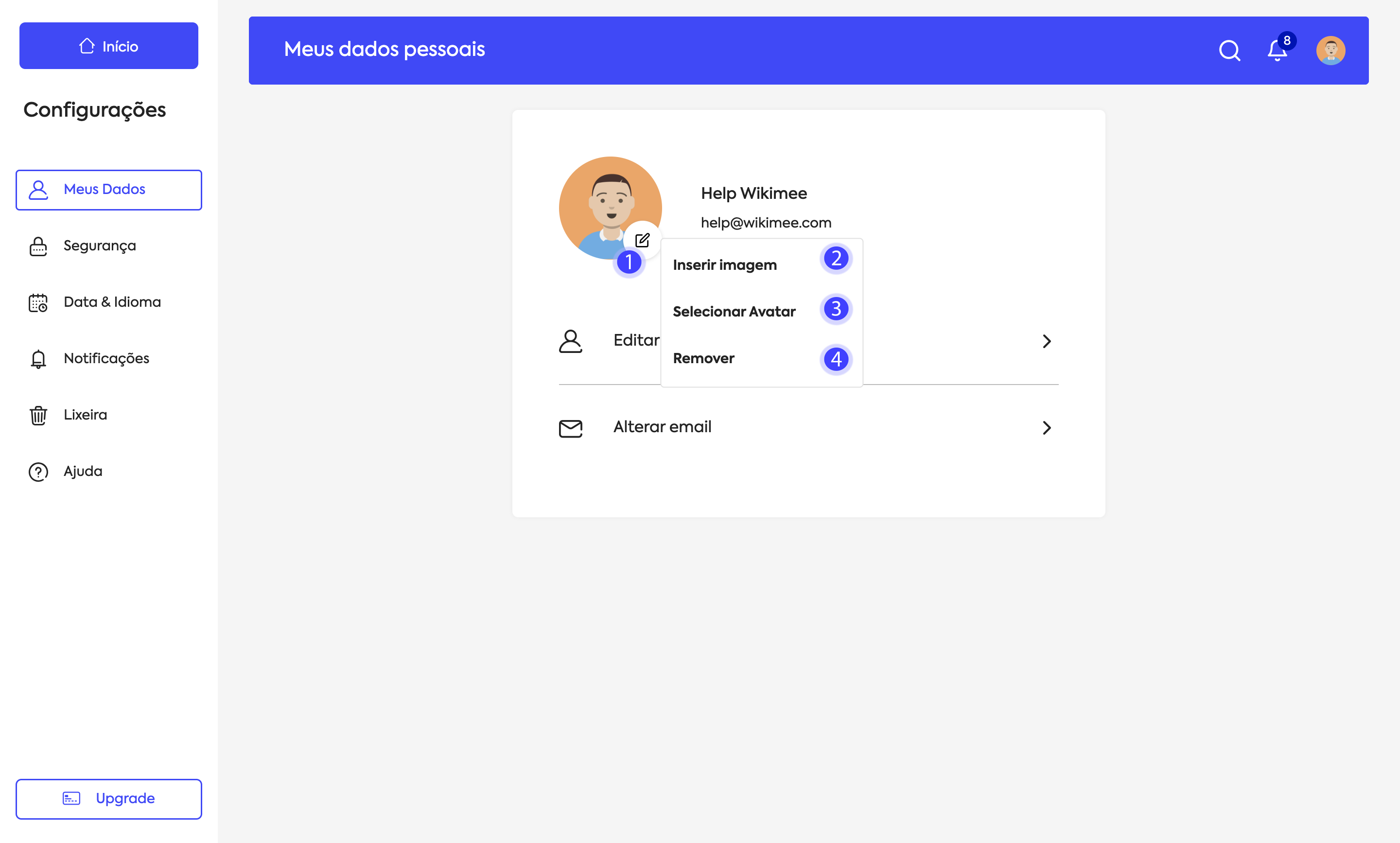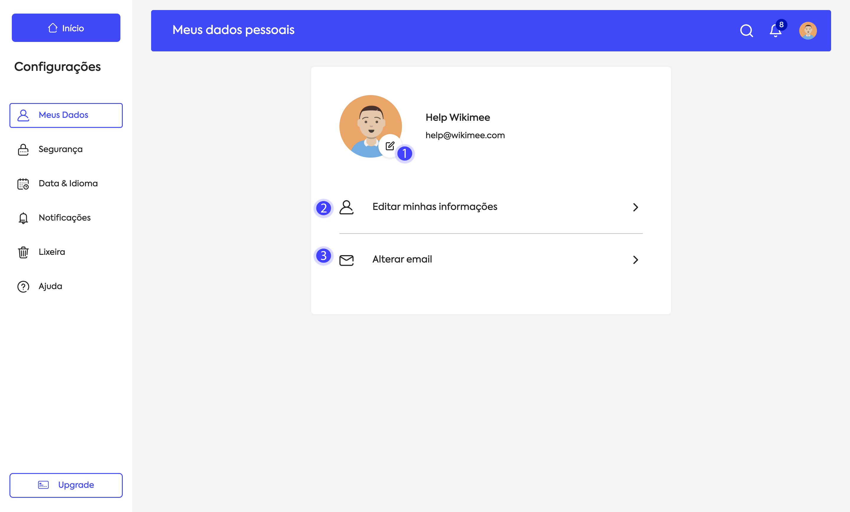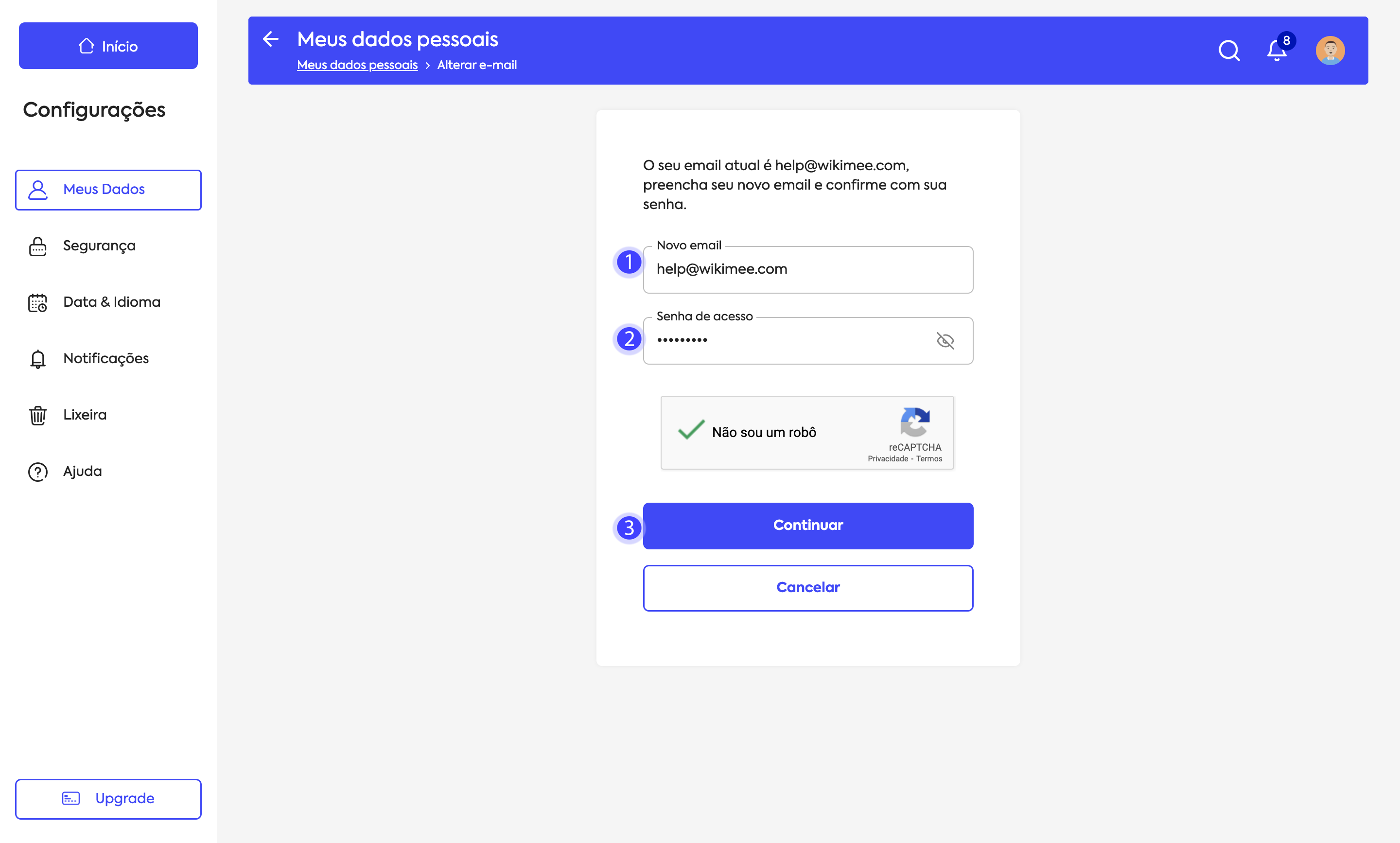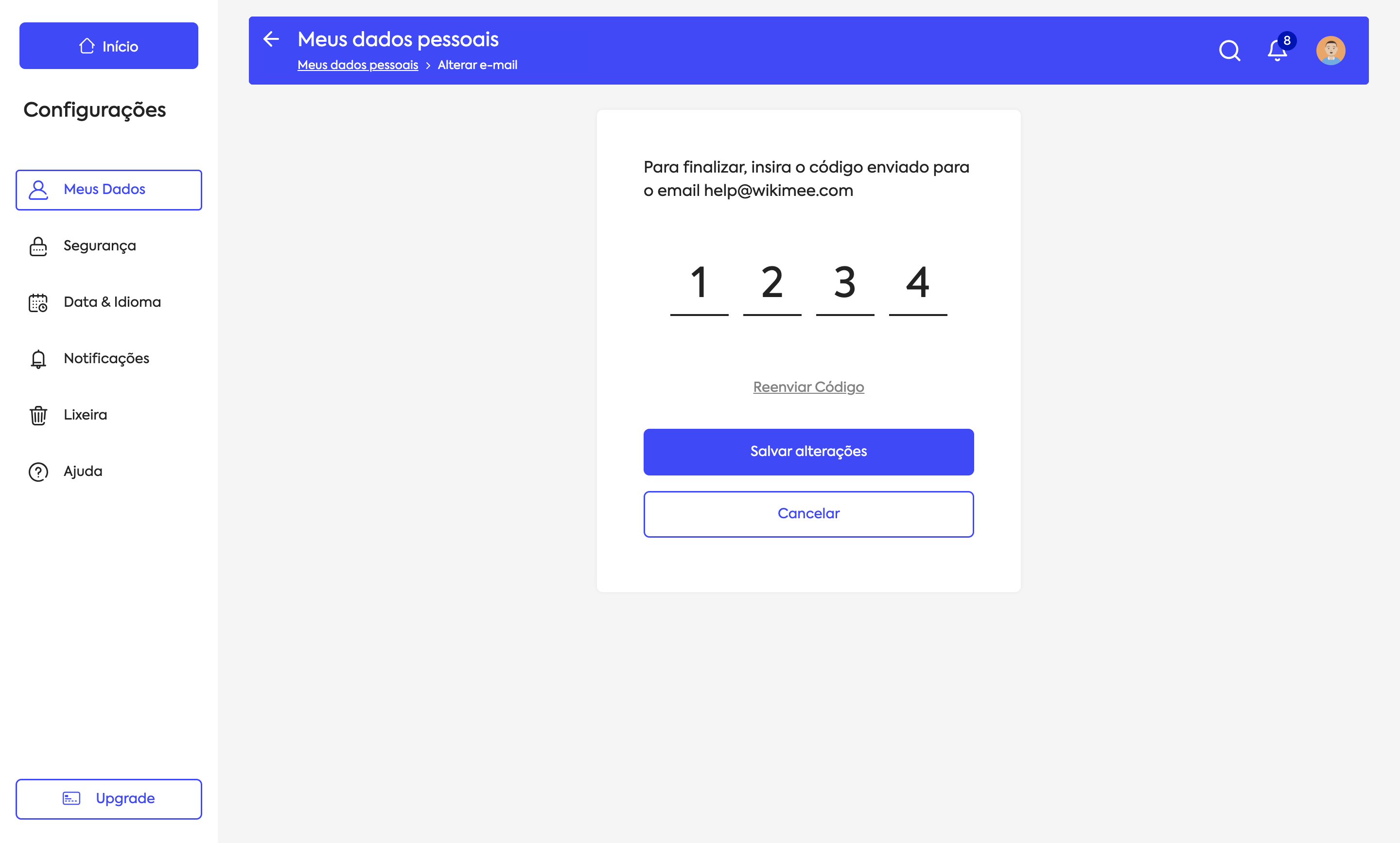 Após acessar Configurações em seu menu de usuário, visualize à sua esquerda no menu lateral a opção Meus Dados para configurar suas informações pessoais e email cadastrado.