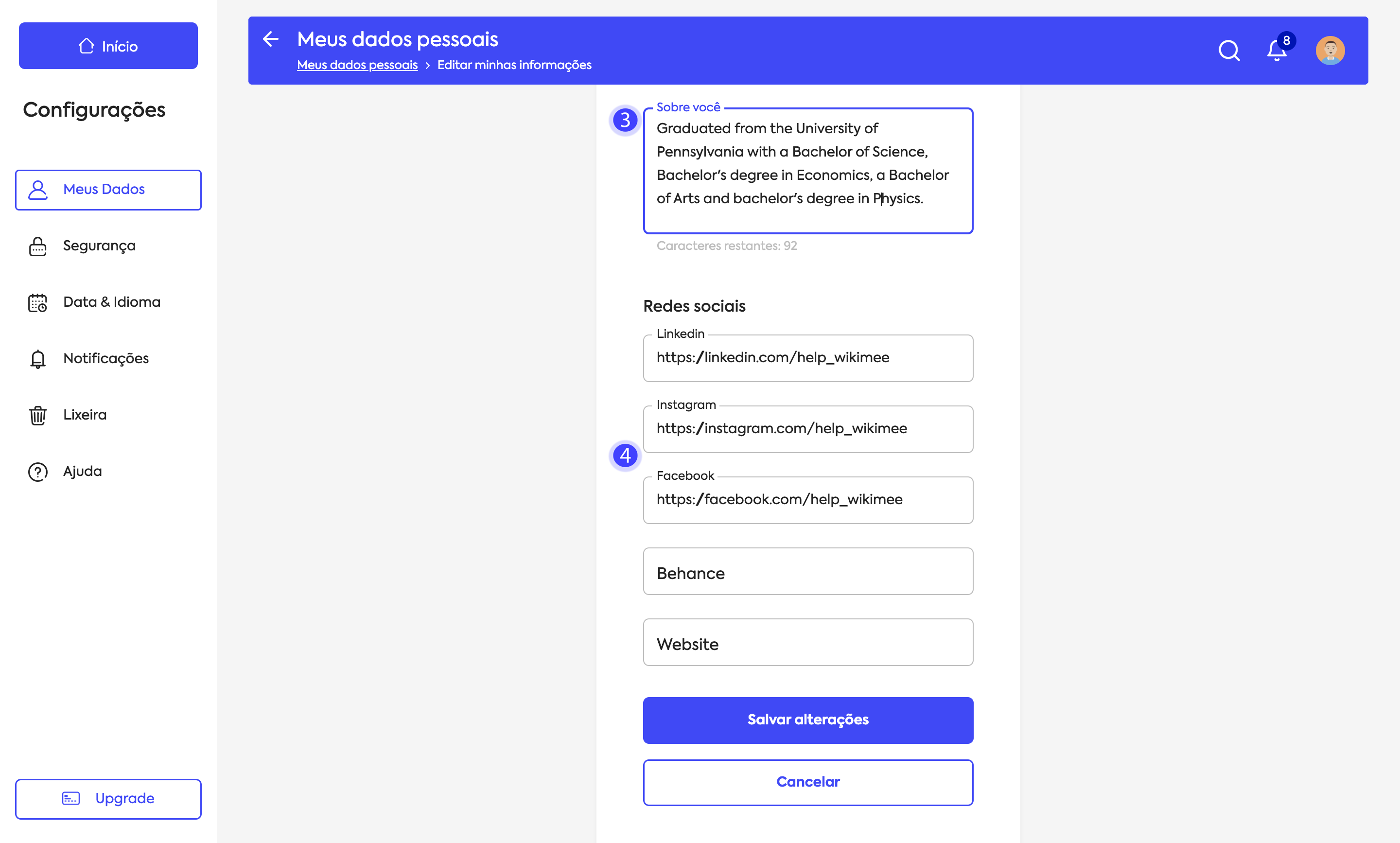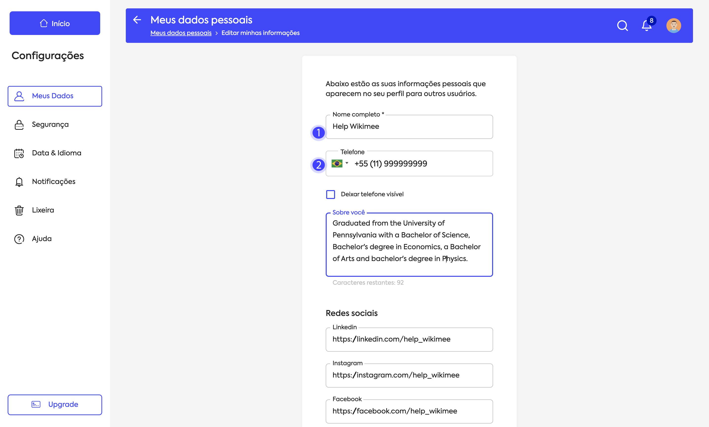 Para configurar suas informações, clique em Editar minhas informações. Em seguida edite: