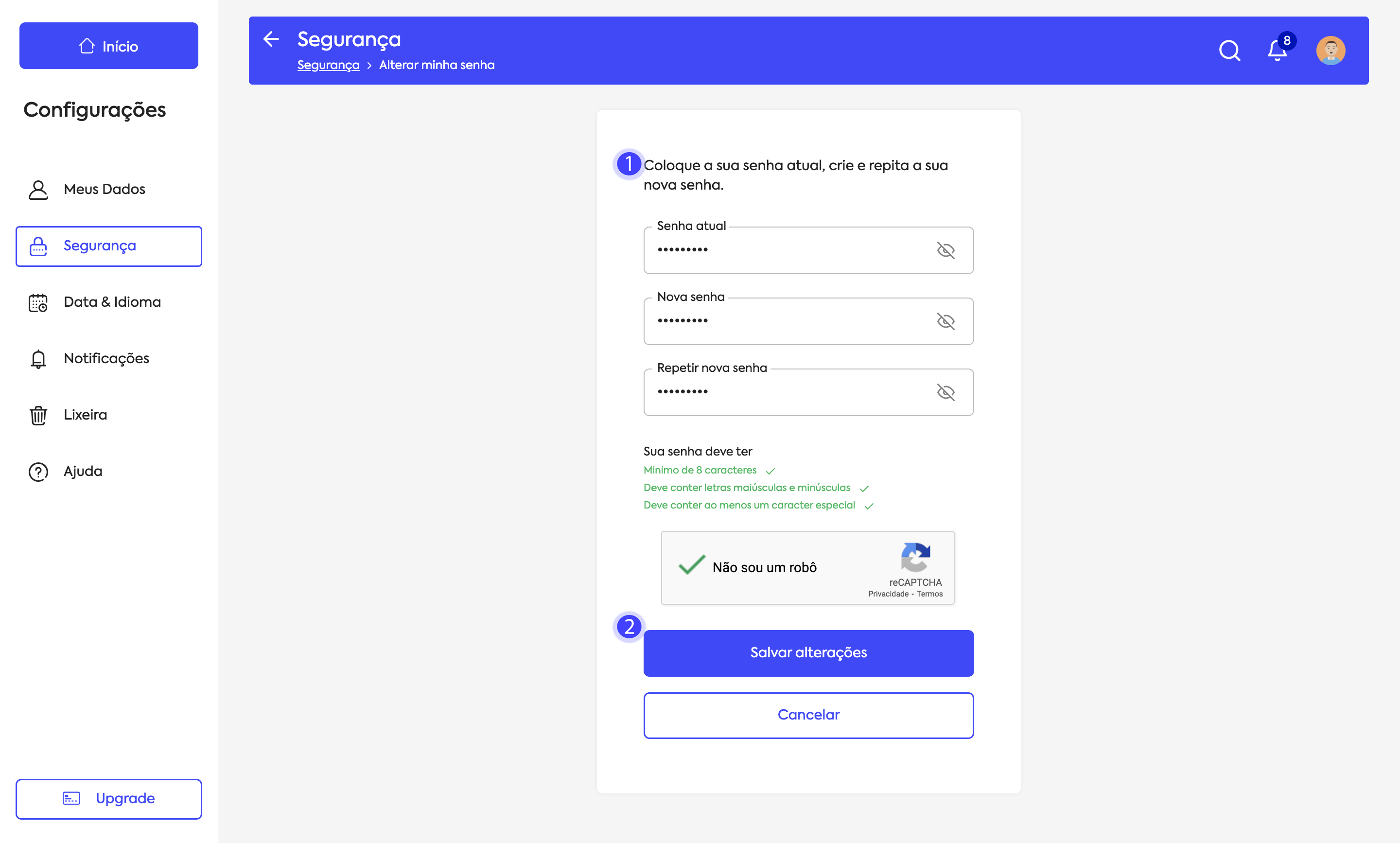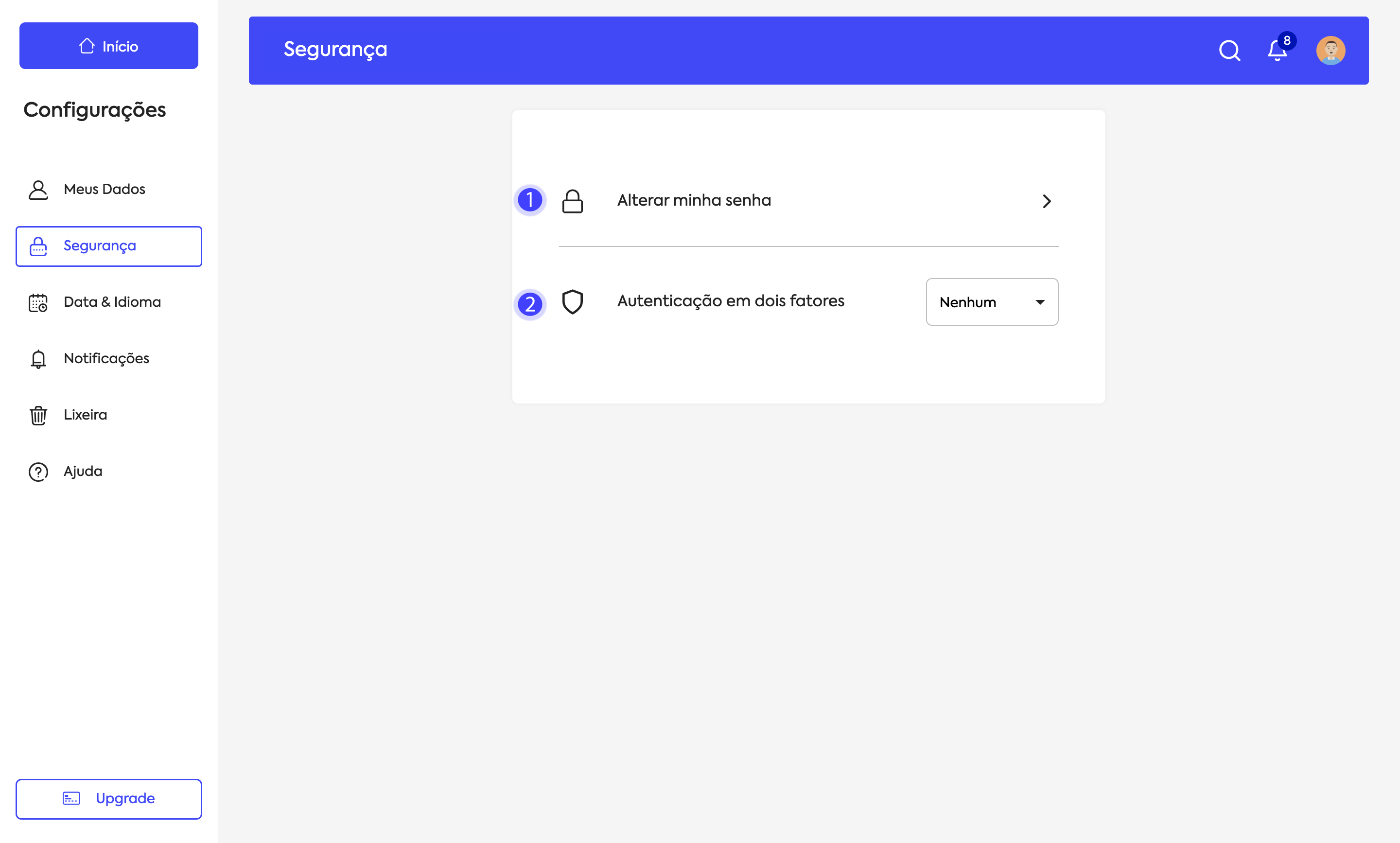 Em suas configurações de usuário, acesse a opção Segurança no menu lateral para: