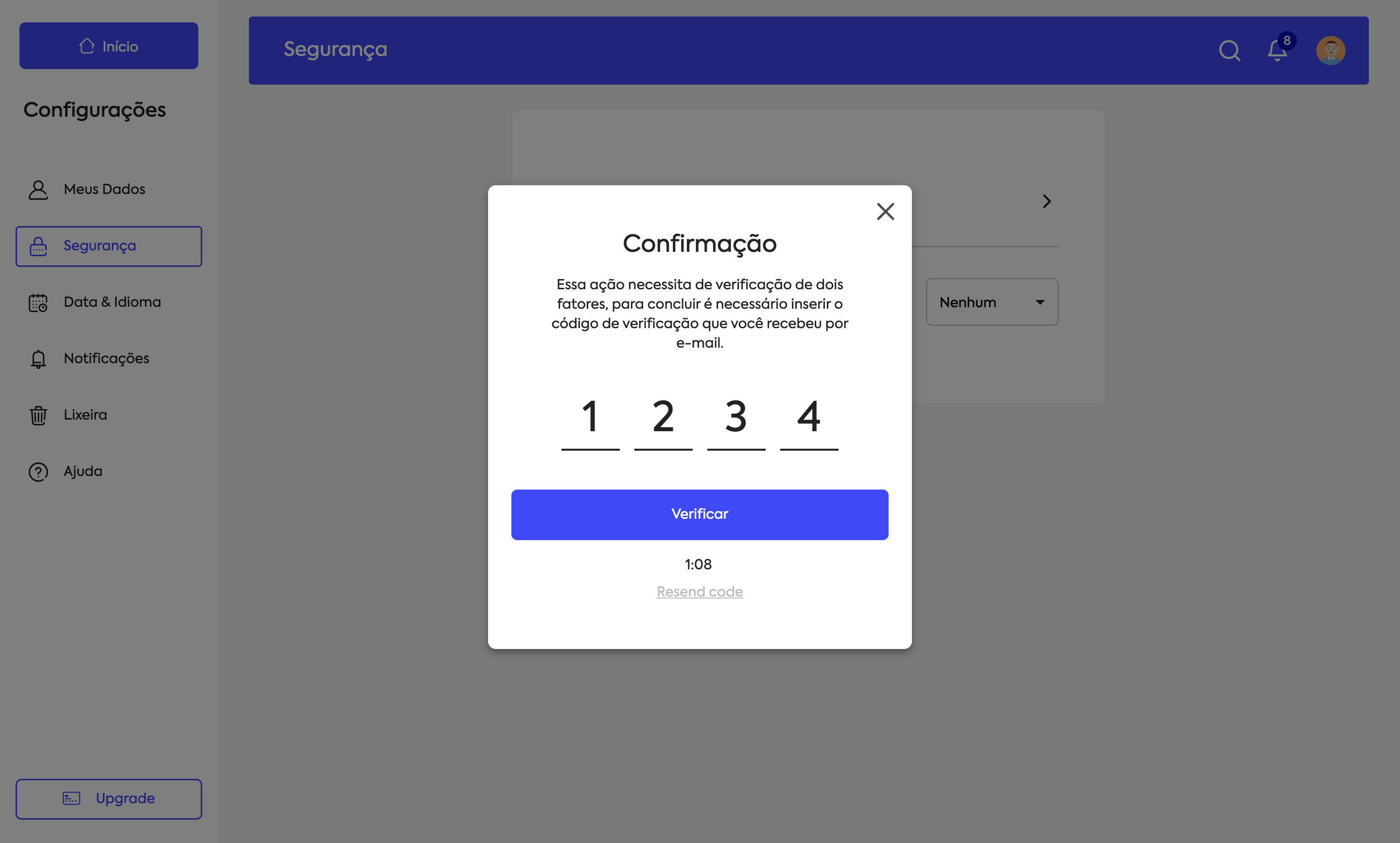 • Um código de confirmação será enviado para seu email cadastrado. Informe o código e clique em Verificar.
