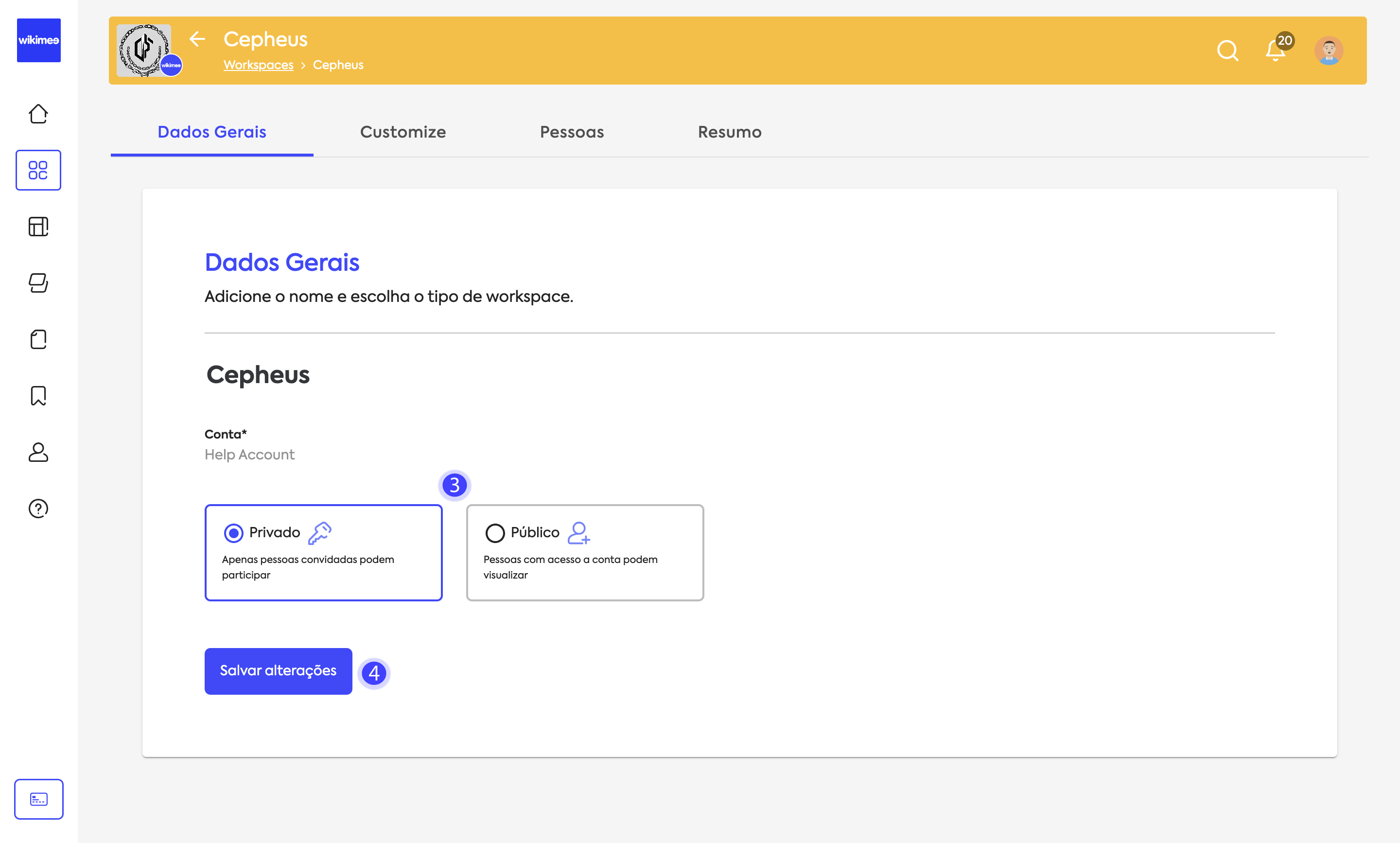 Ativando a opção privado, apenas pessoas que foram convidadas a participar do workspace, como gestor, editor ou visualizador poderão visualizar as iniciativas e arquivos deste workspace. Esta opção é a mais adequada para workspaces com conteúdo sensível, e para organizações que precisam segmentar a estrutura hierárquica por níveis de acesso em uma conta.