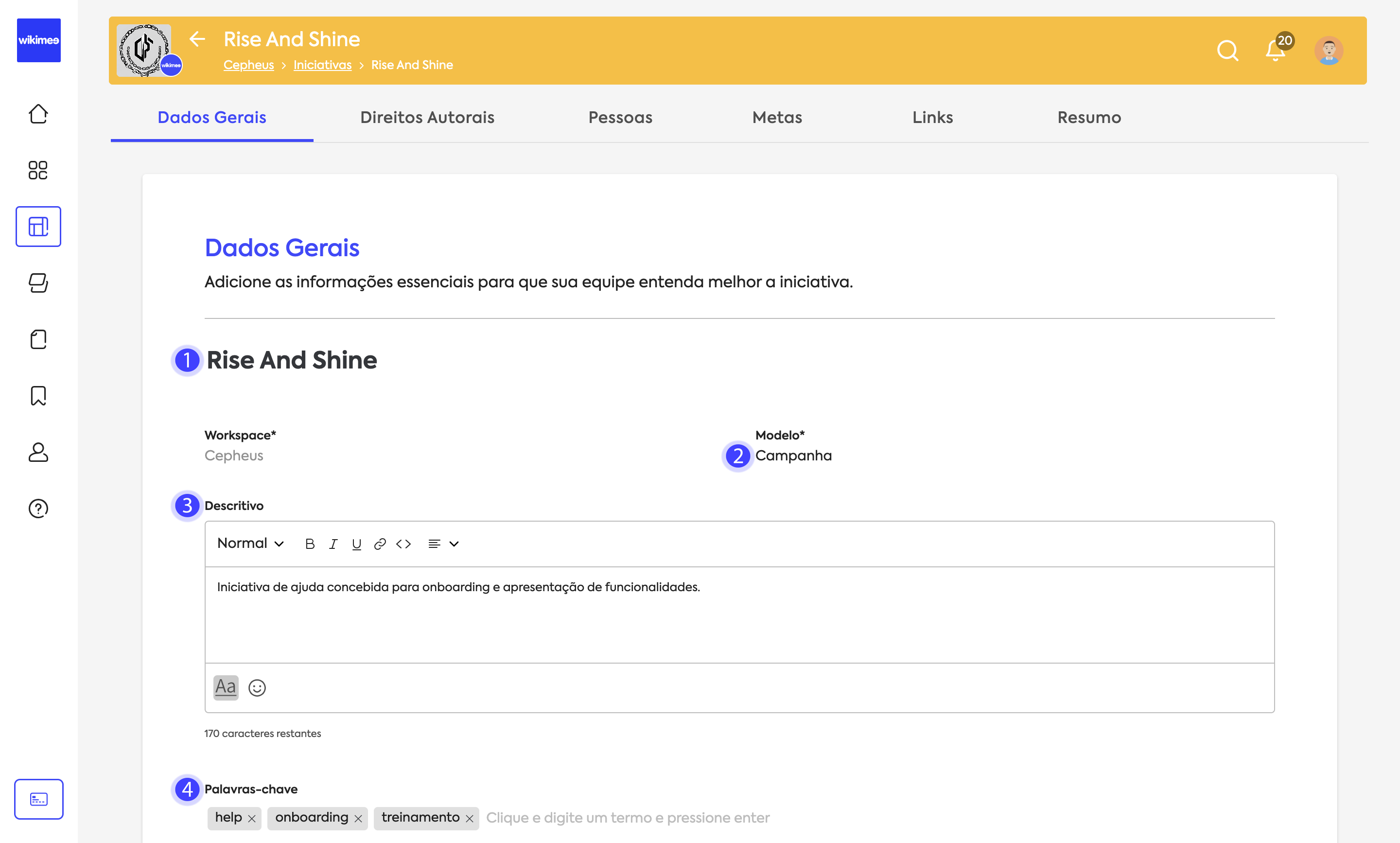 Configure as informações descritivas e as demais informações essenciais de sua iniciativa na aba Dados Gerais: