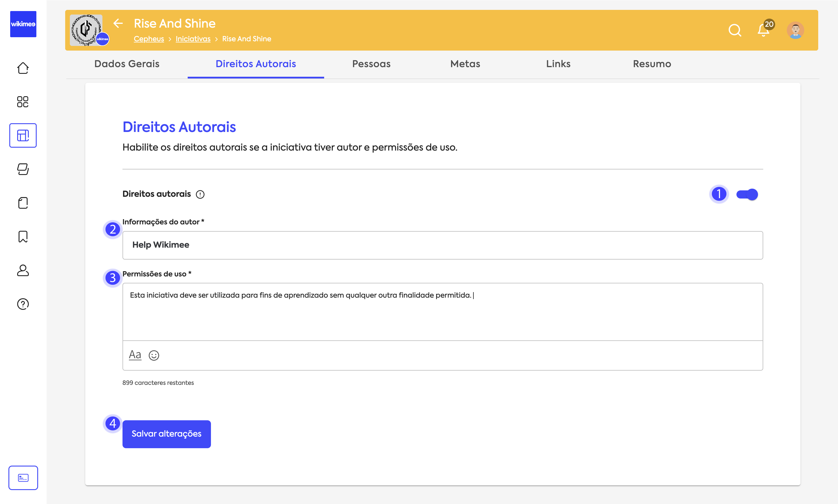 | Habilite o seletor de direitos autorais caso a iniciativa possua permissões de uso. | |