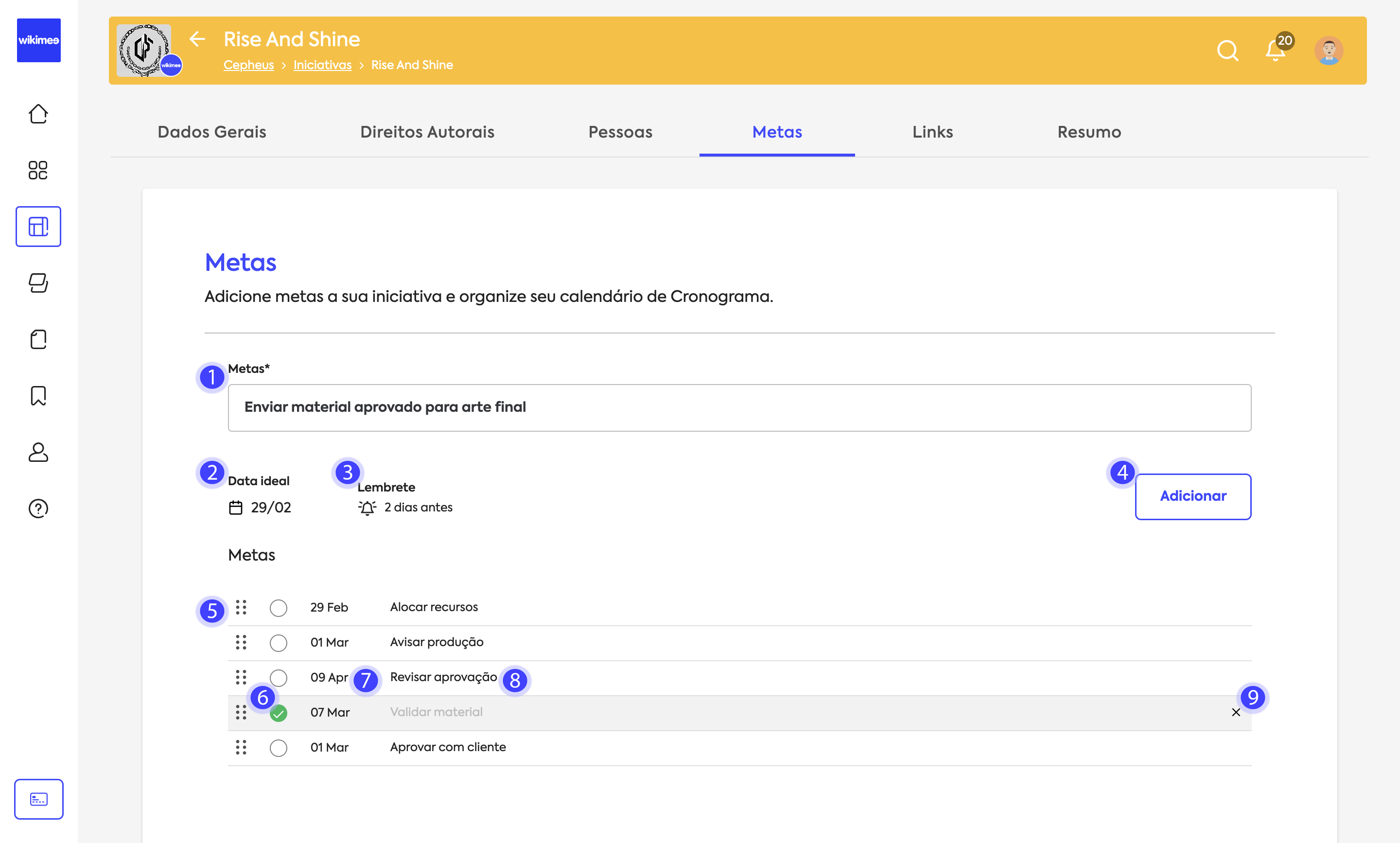 Crie ou conclua objetivos para sua Iniciativa ou Cronograma utilizando as Metas: