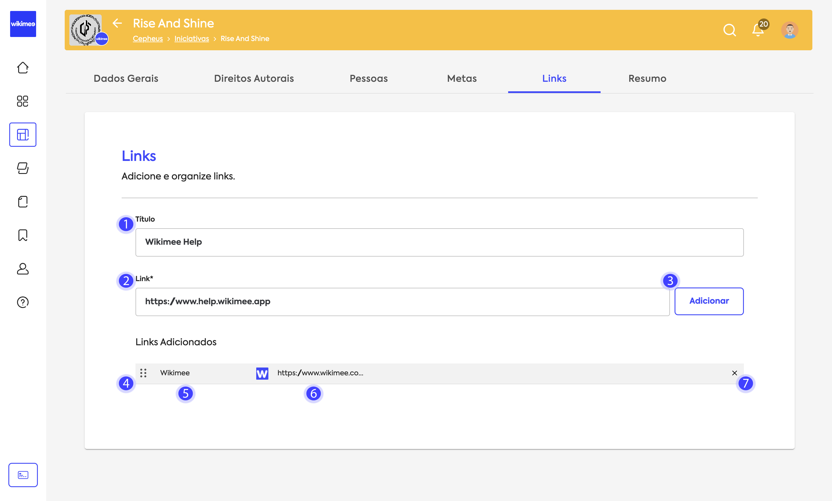 Adicione ou remova links da iniciativa em Links: