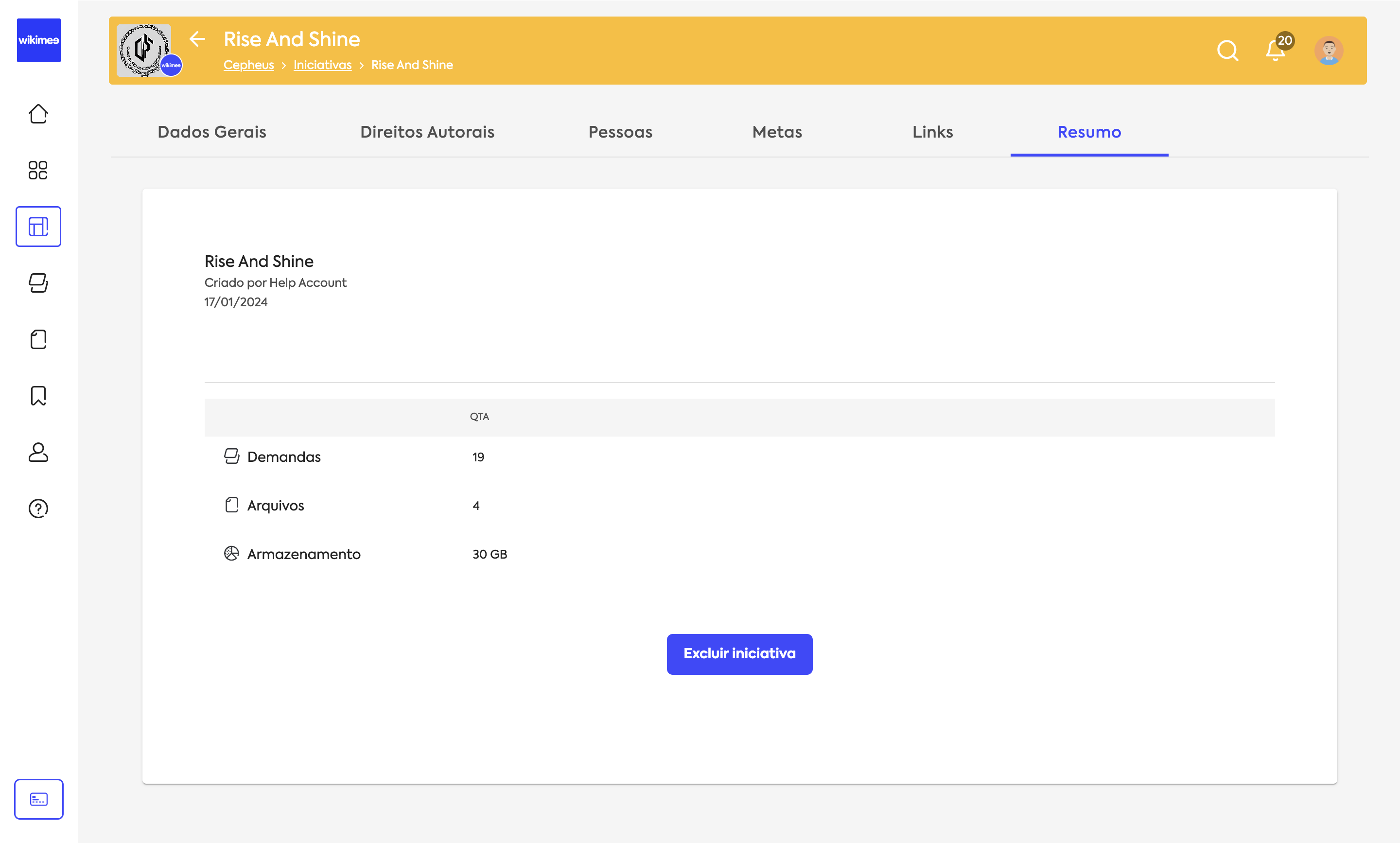 Para excluir uma iniciativa, acesse Resumo e clique em Excluir iniciativa. Você ainda poderá recuperá-la em sua lixeira se necessário.