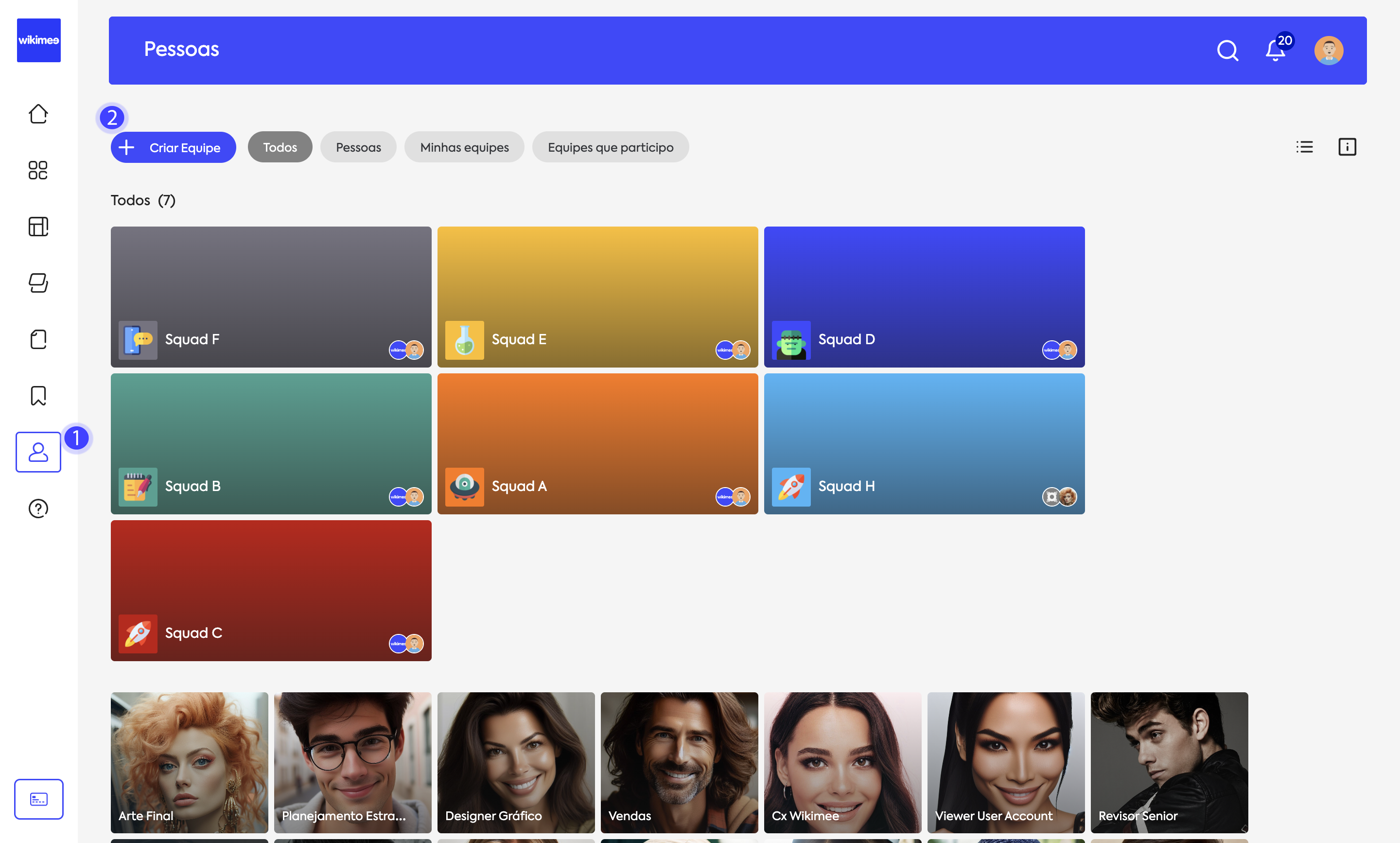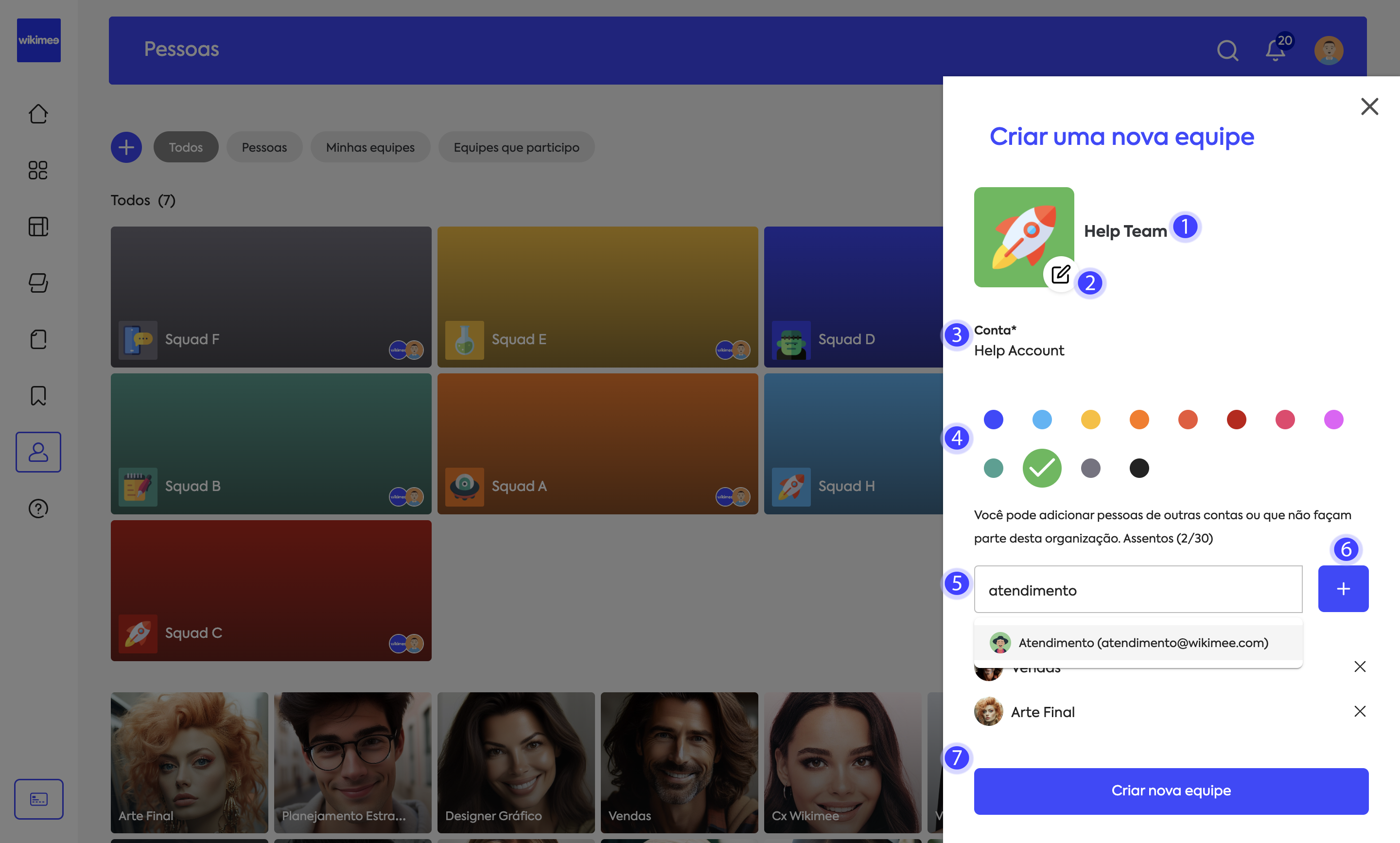 Crie equipes em sua conta, e adicione pessoas à estas equipes para relacioná-las a demandas, iniciativas ou workspaces.