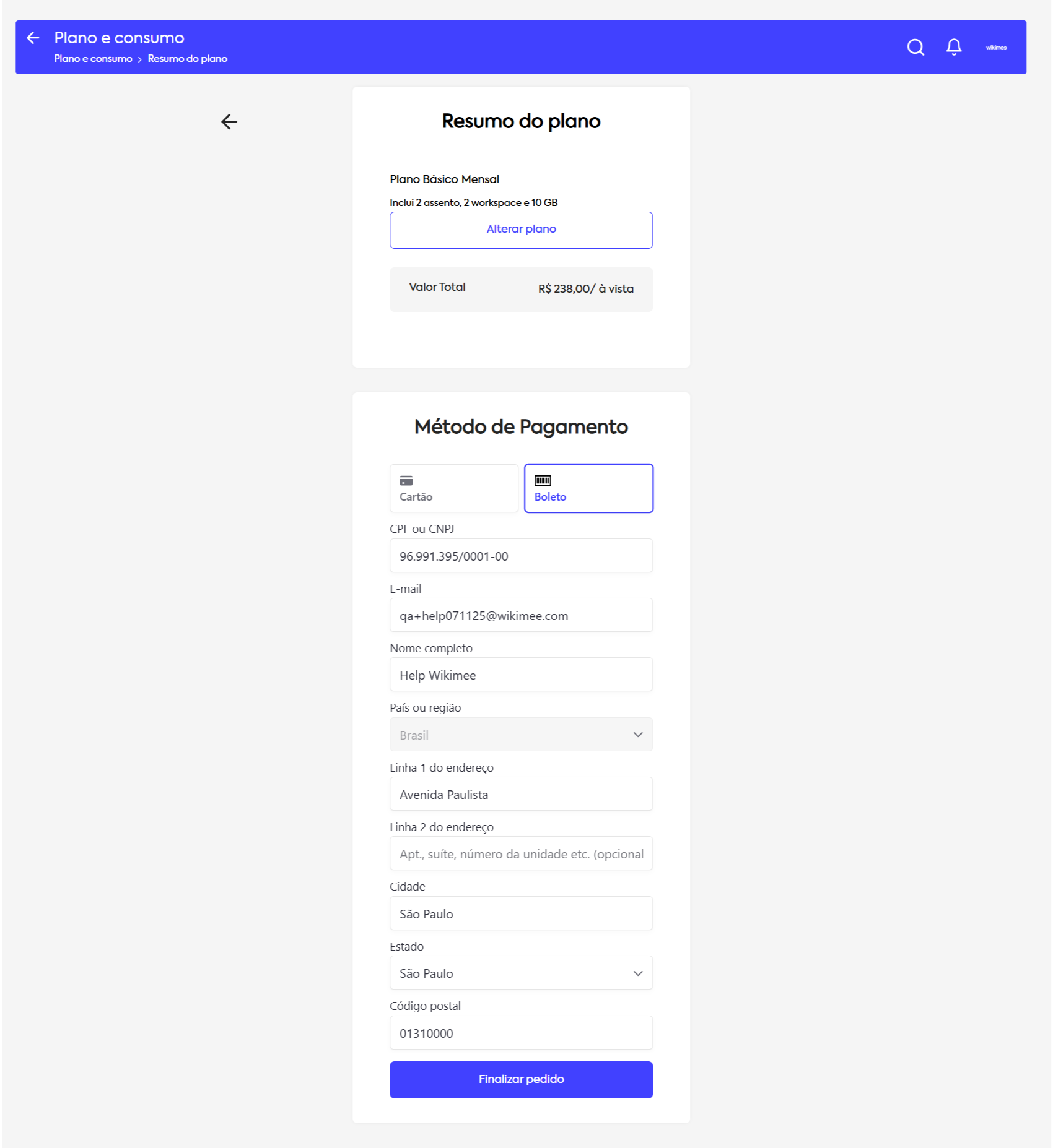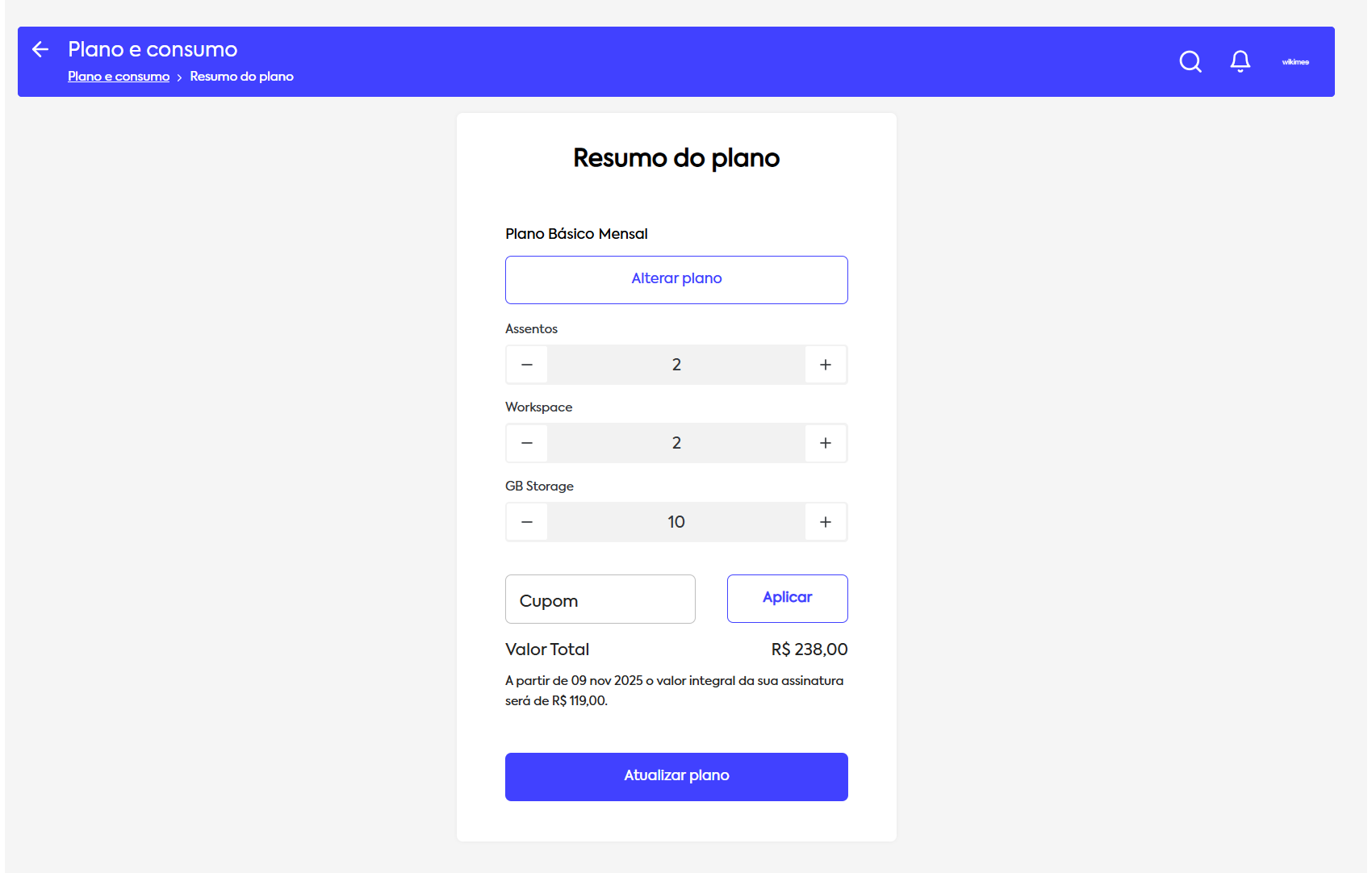 Se você recebeu algum cupom de desconto, informe no campo correspondente e clique em Aplicar. Em seguida, clique em Atualizar plano.