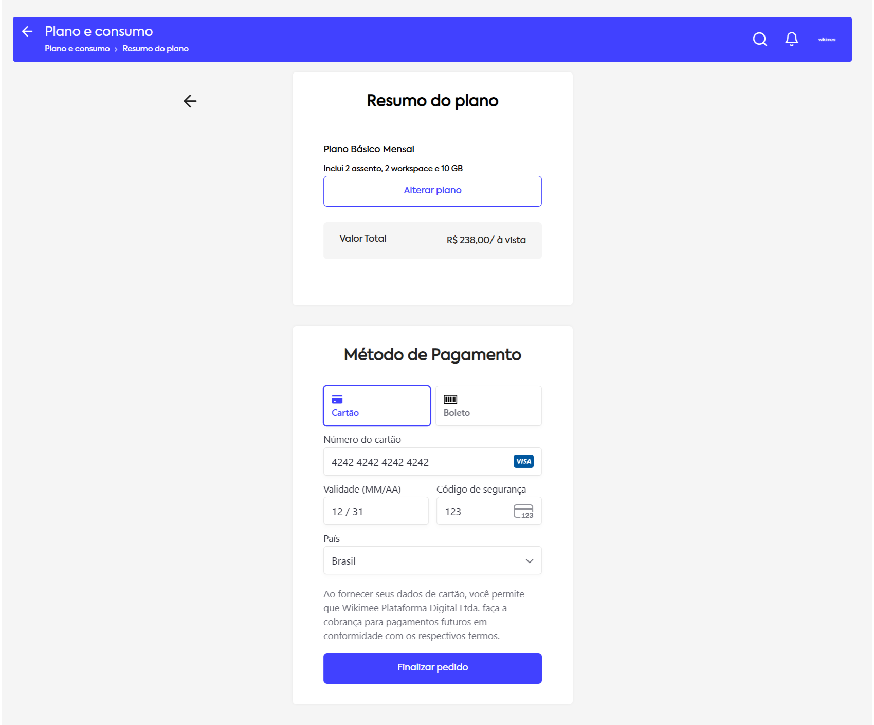 No passo seguinte, defina quantos assentos, workspaces e armazenamento você deseja para seu plano. Para saber mais sobre os recursos e funcionalidades disponíveis em cada plano, clique aqui.