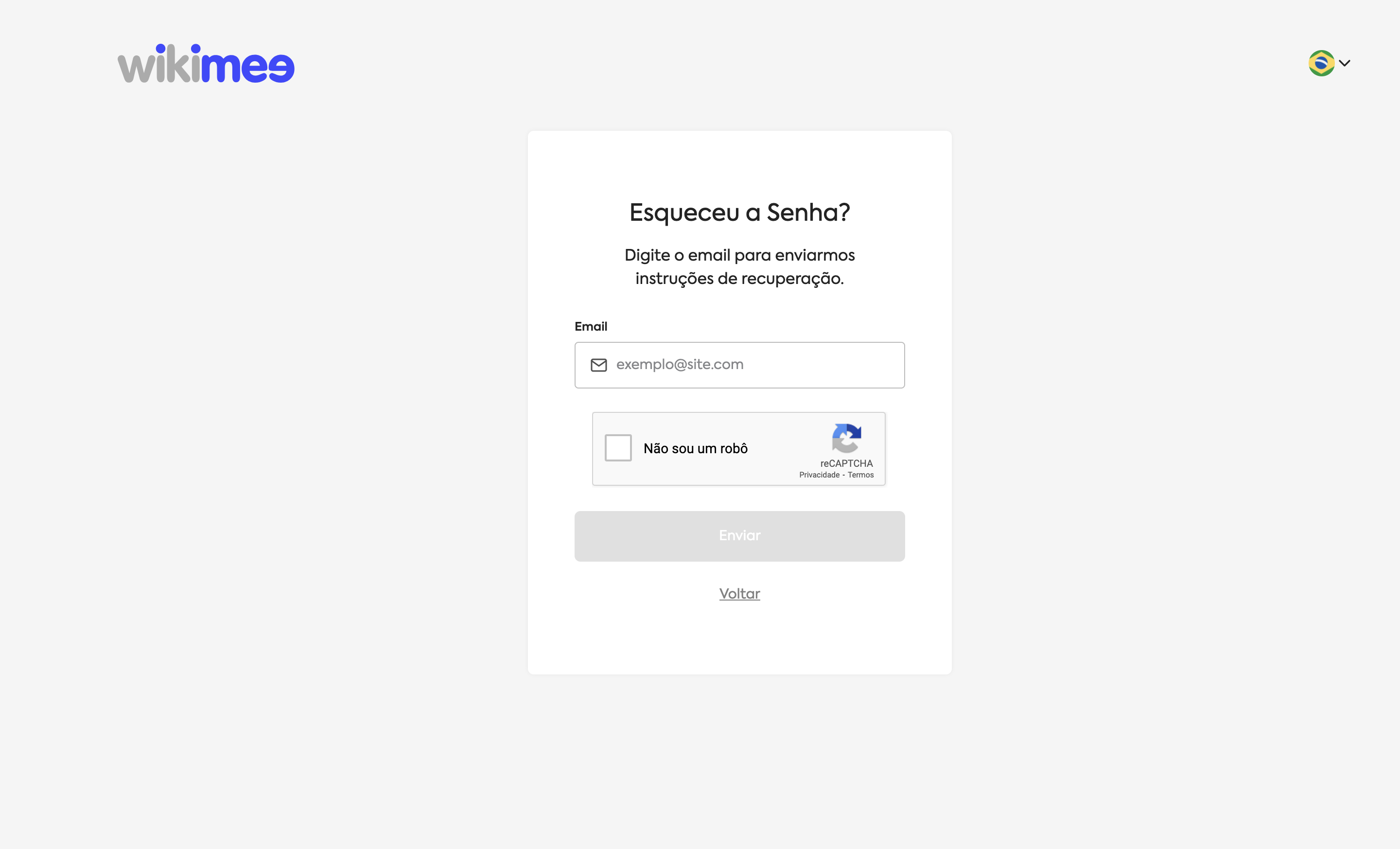 - Informe o email cadastrado em sua conta do Wikimee e clique em Enviar. Você receberá um email para redefinir sua senha.