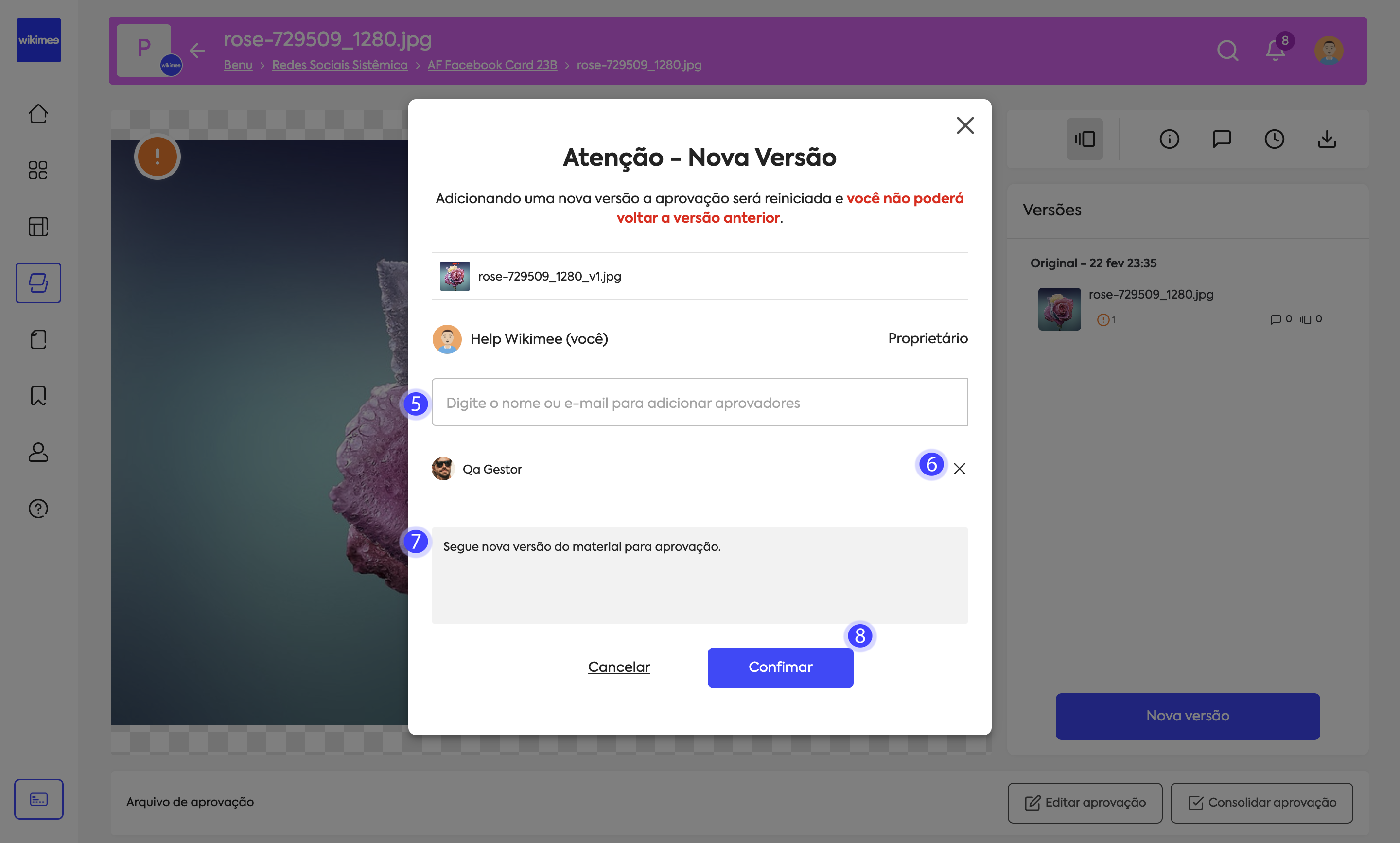 Fique atento: Caso haja outros arquivos em aprovação aguardando sua consolidação, a adição ou remoção de aprovadores da nova versão será replicada para todas as aprovações pendentes.
