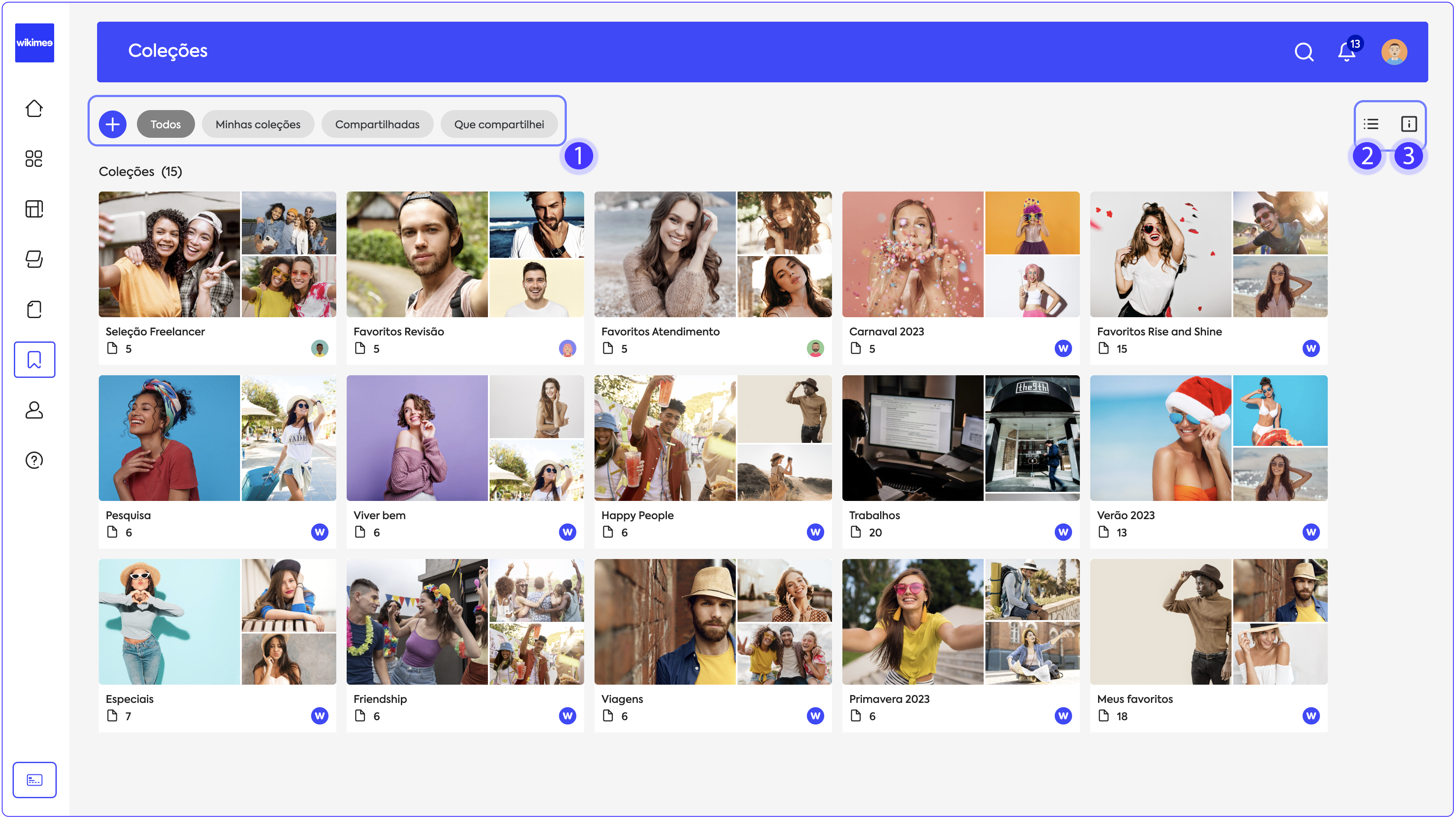 1 Os seletores de visualização para filtrar a exibição das pastas.