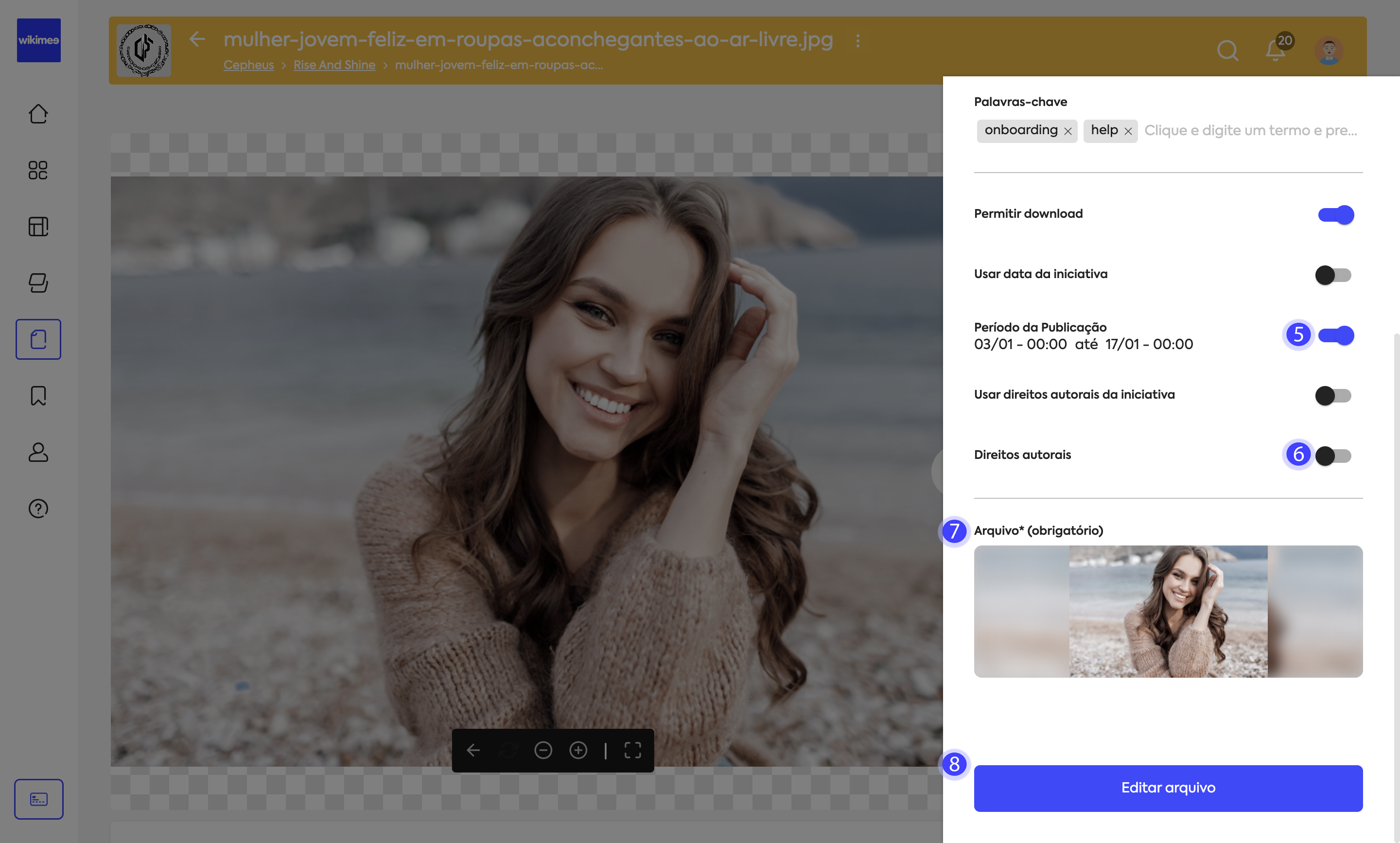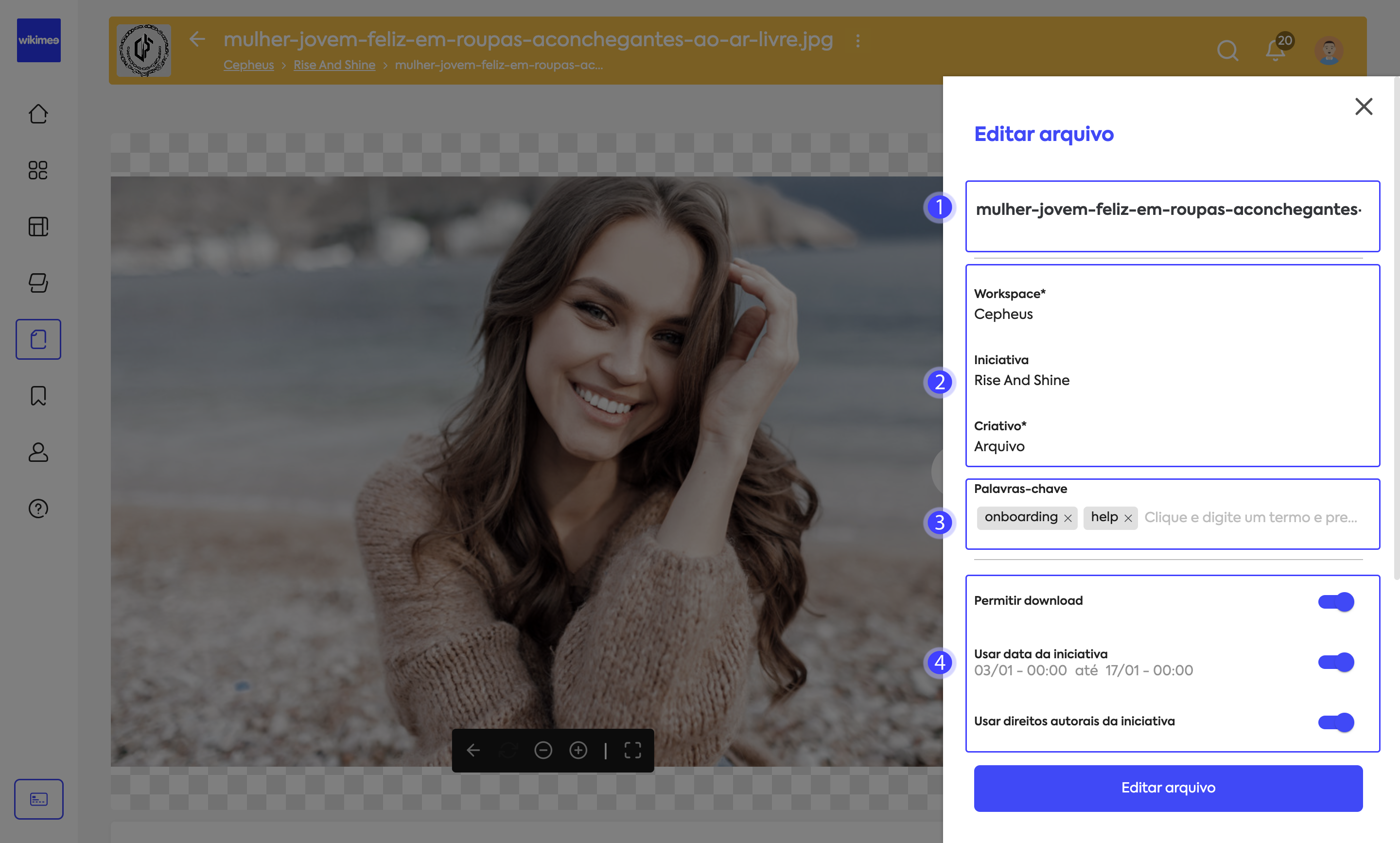 Acesse a edição de arquivo para atualizar seus dados gerais, informações do conteúdo e especificações técnicas do arquivo, ou substitua o arquivo atual por uma nova versão.