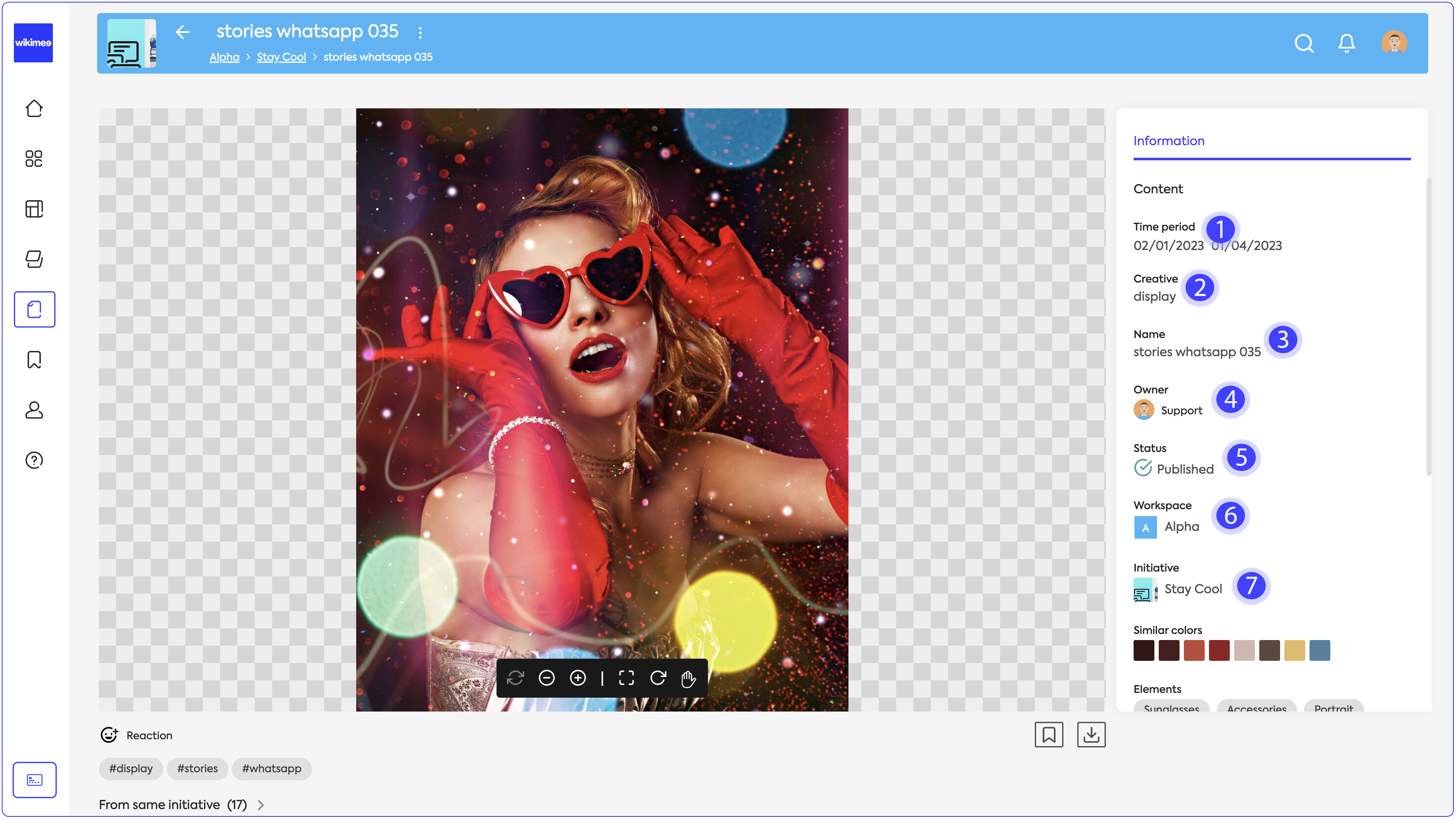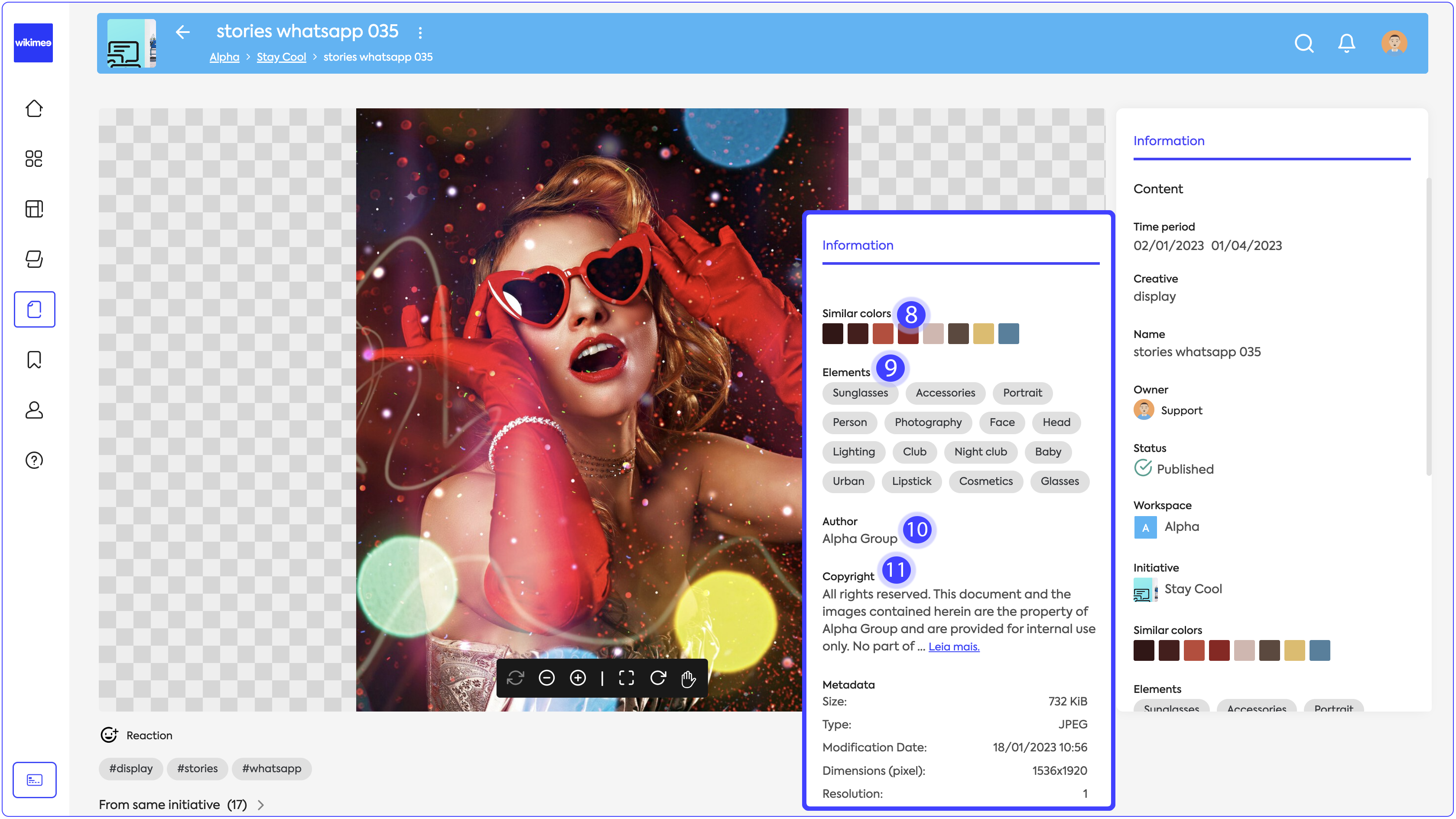 Previewing a file provides users with a detailed description of the files in a workspace or initiative, including general information such as asset type, publication status, and source, as well as information generated by Wikimee's AI.