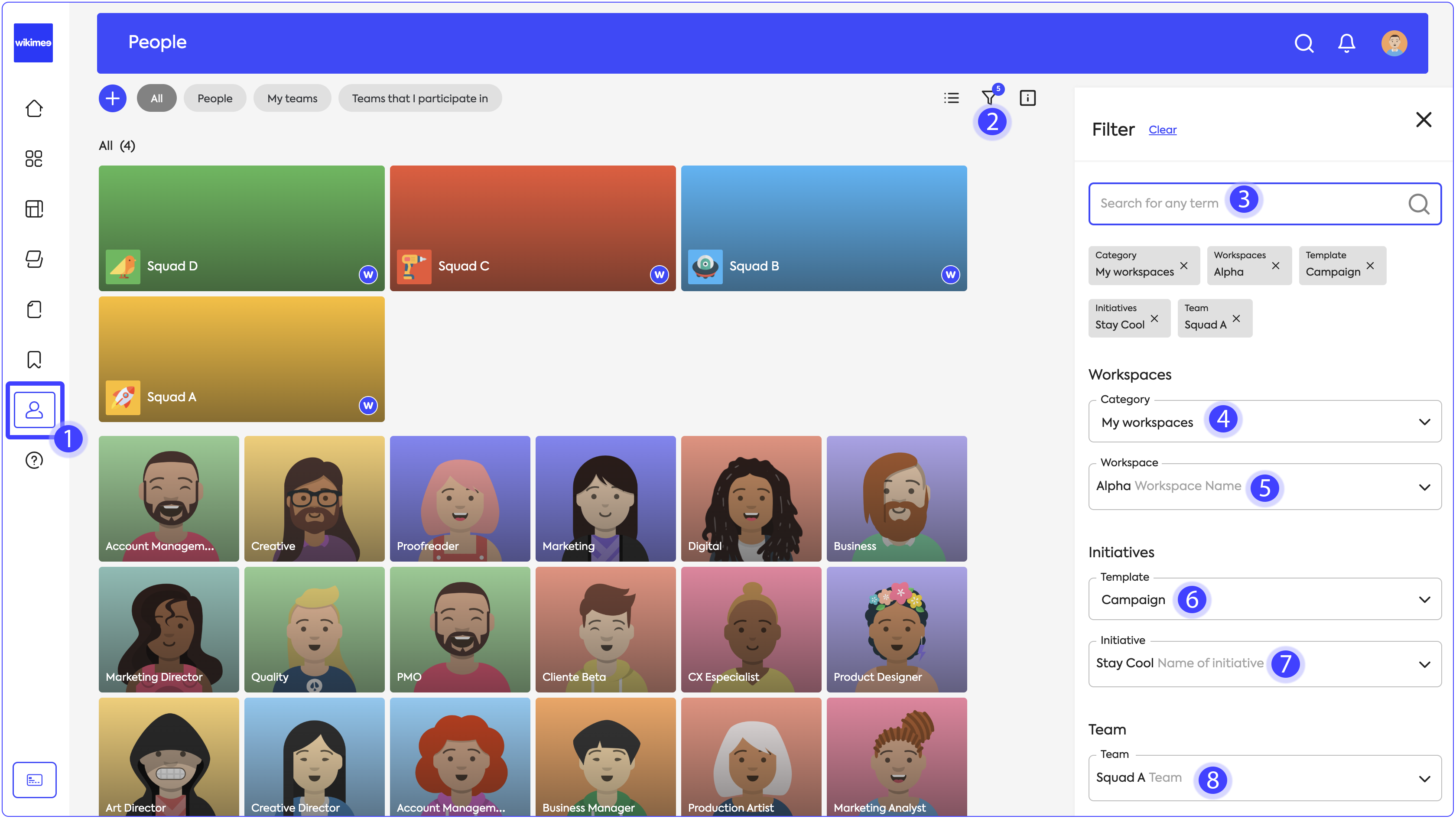 To manage people and teams or track demands, workspaces, and initiatives related to a specific person or team, based on your access permissions, the People section offers a searching and filtering feature.