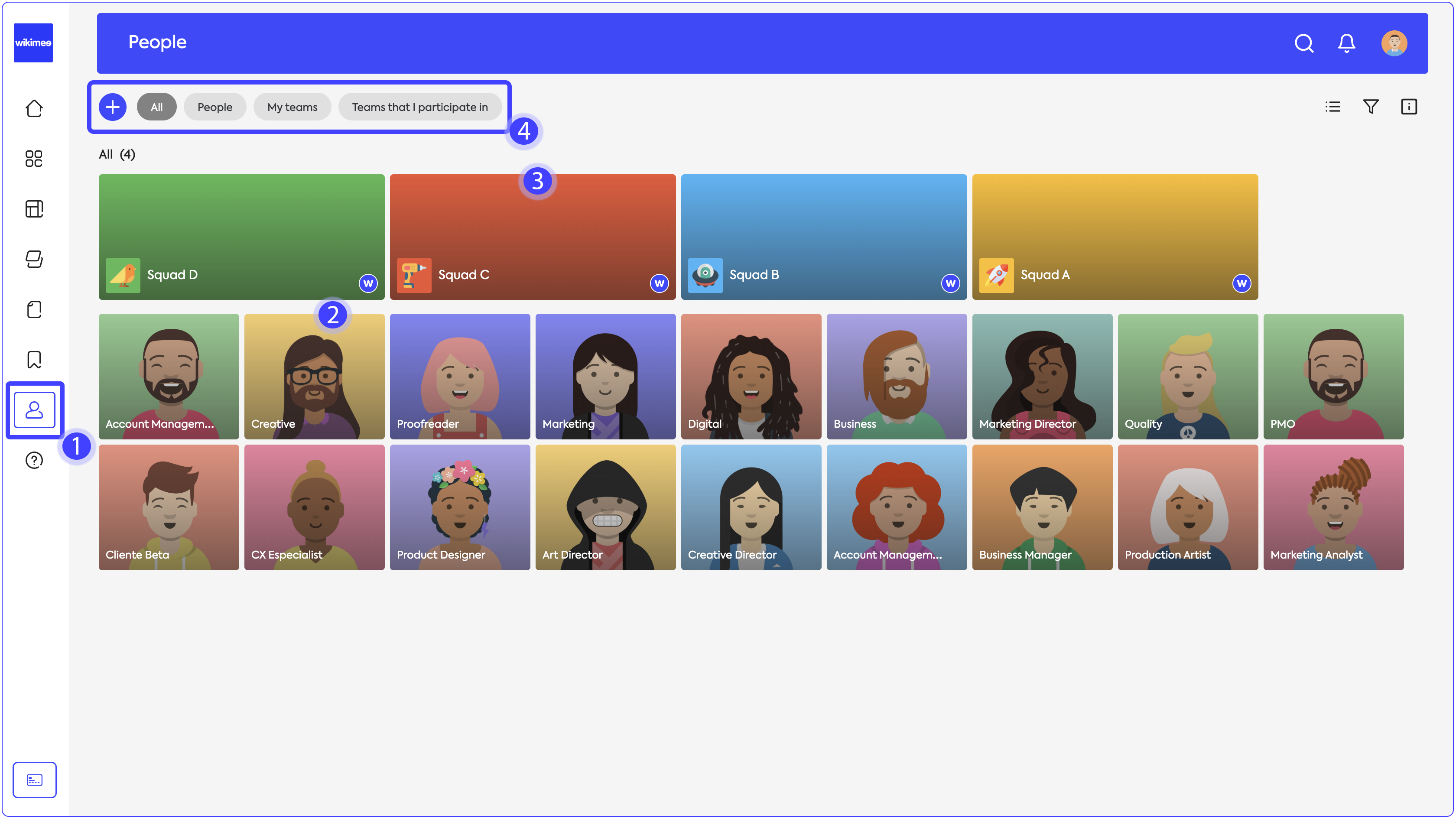 The People section provides access to all people and teams related to your personal or corporate account. A user can also view the teams they are involved in as a participant to consult tasks, initiatives, and workspaces in common.