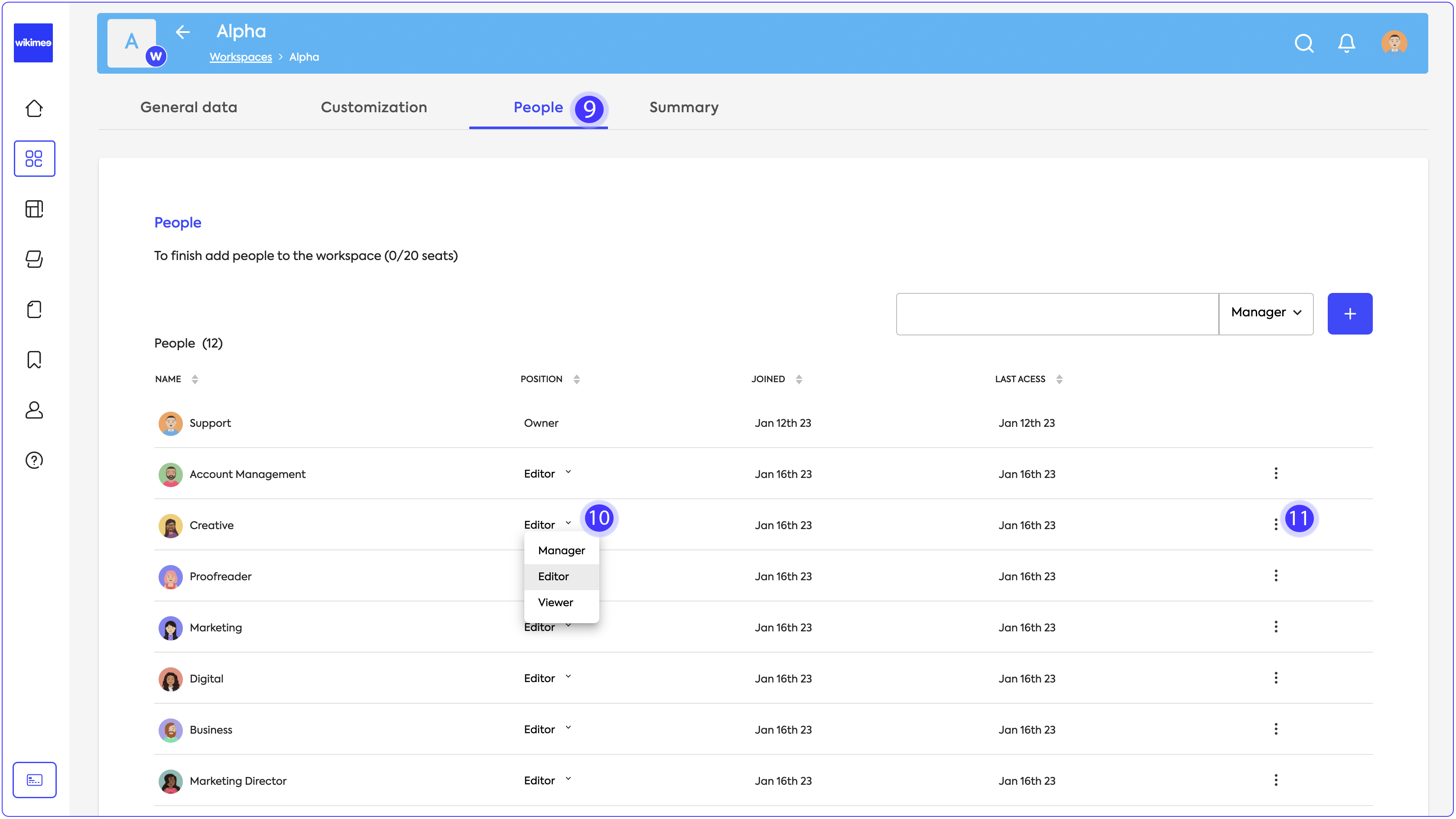 - In the column corresponding to Role, select one of the options: Manager, Editor, or Viewer