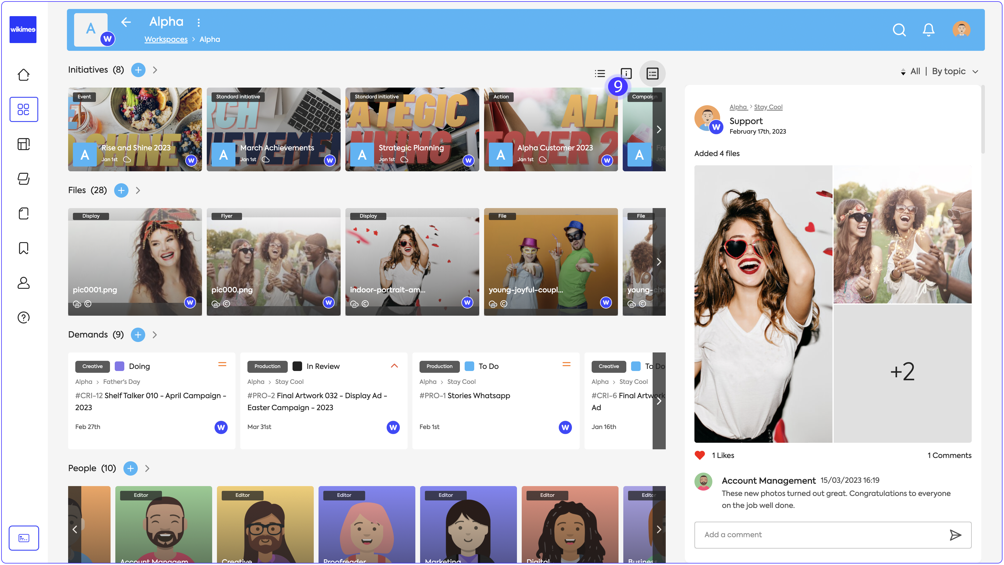 In your workspace on Wikimee, you can track the development of initiatives, files, and demands, access published content, and manage your corresponding teams.