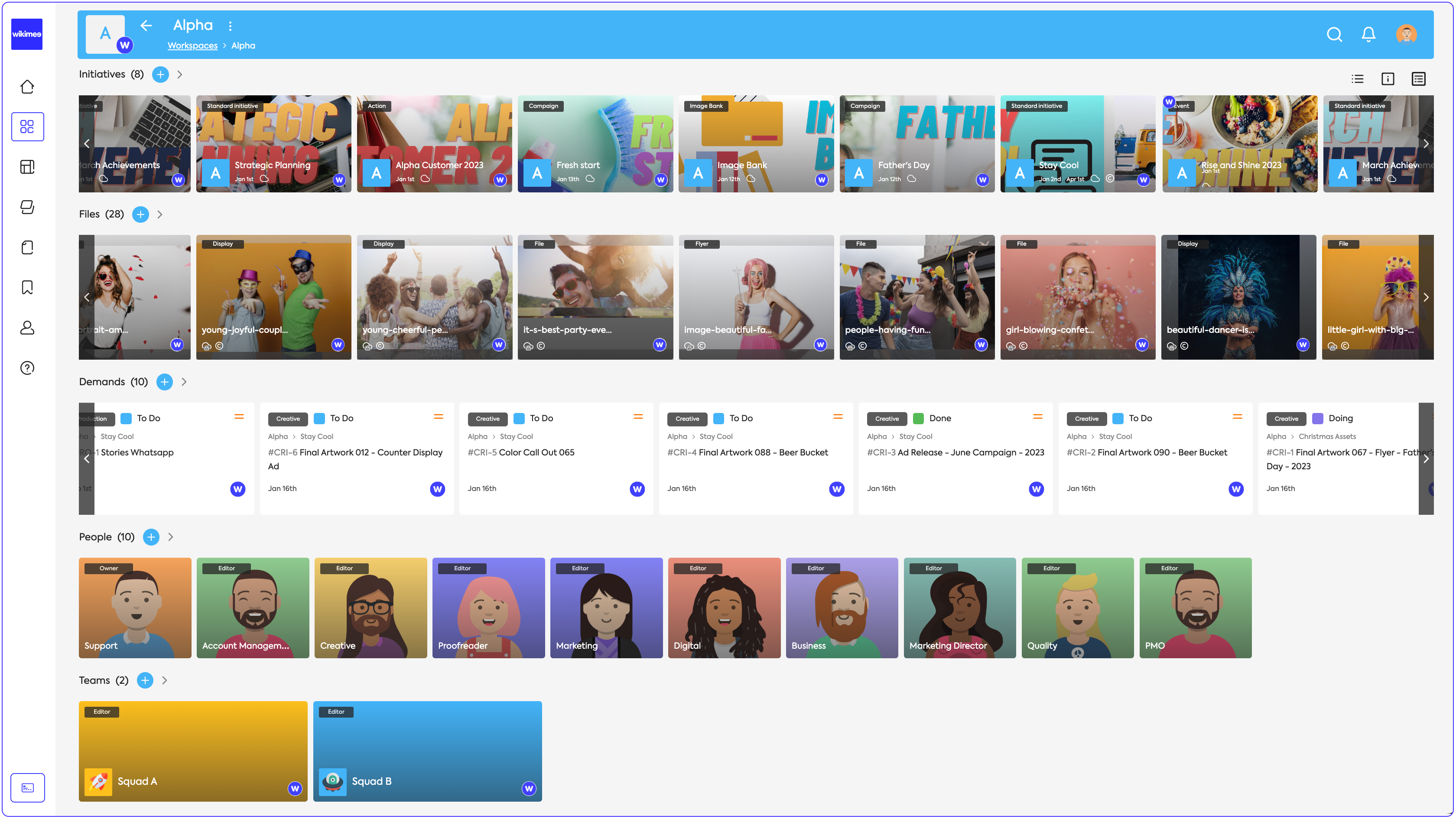 A workspace brings together in one place: Initiatives, Files, Demands, People, and Teams. This space can be segmented in different ways: