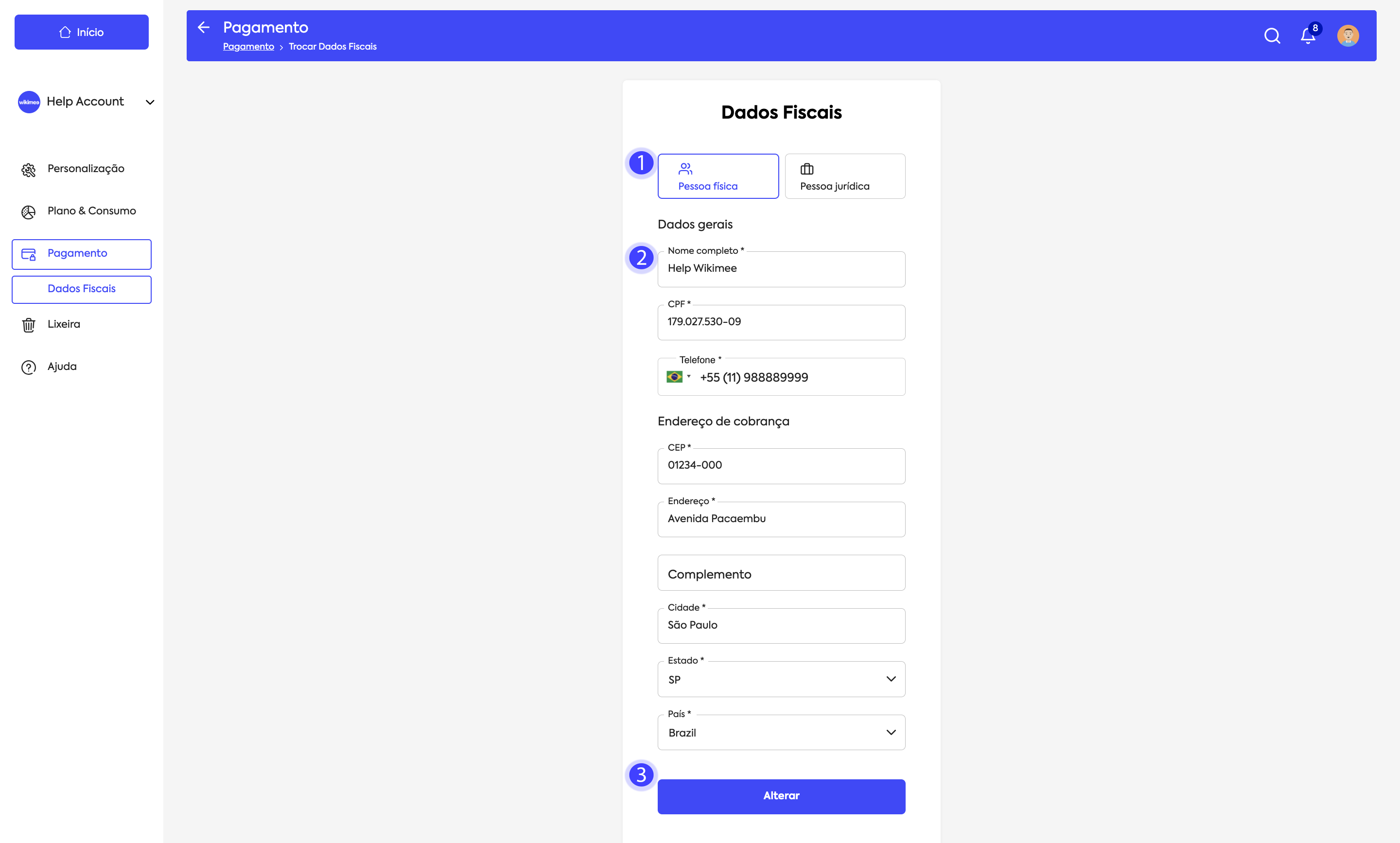 Para alterar ou atualizar sua forma de pagamento clique no botão Alterar.