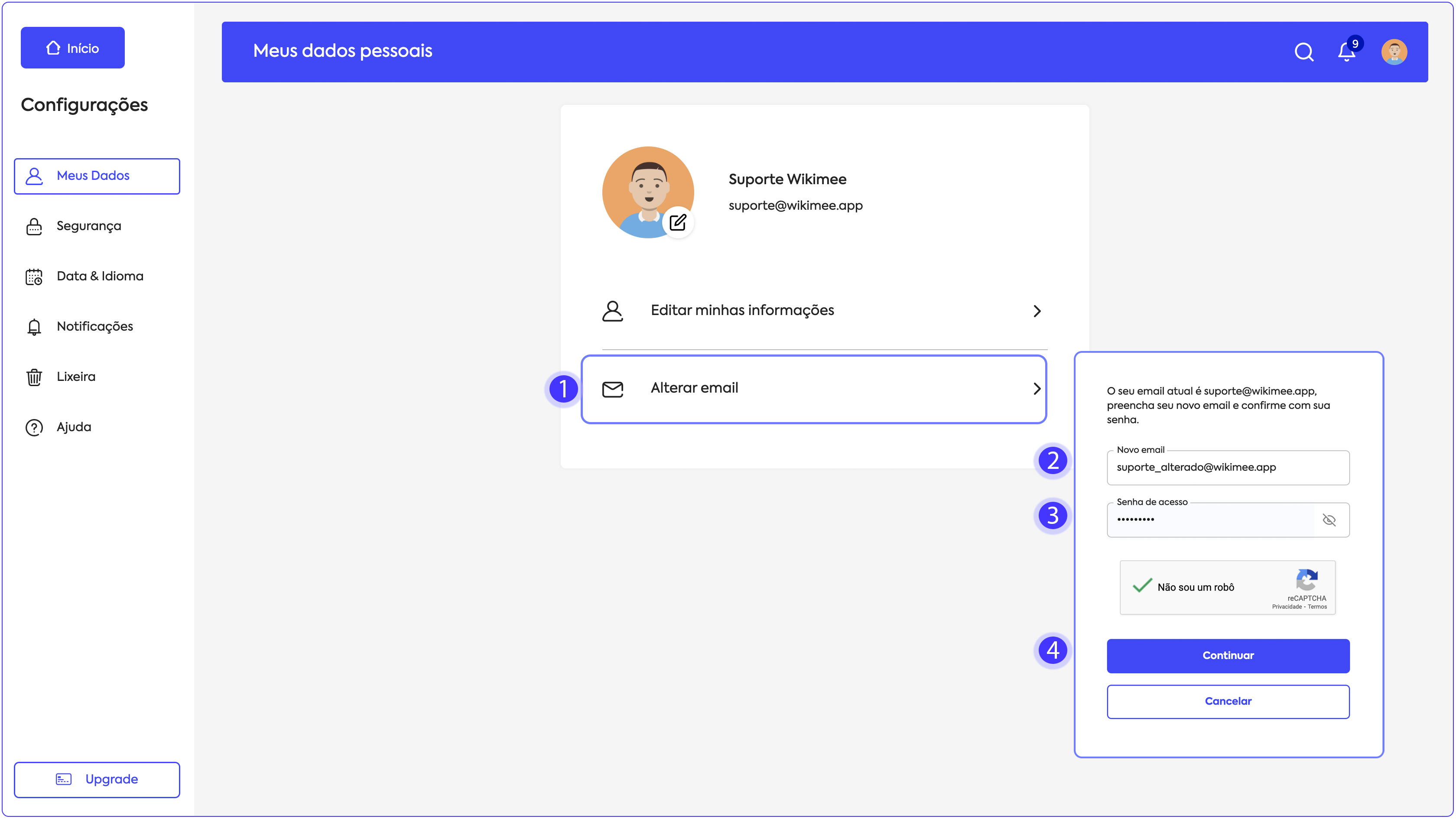 Após acessar Configurações em seu menu de usuário, visualize à sua esquerda no menu lateral a opção Meus Dados para configurar suas informações pessoais e email cadastrado.