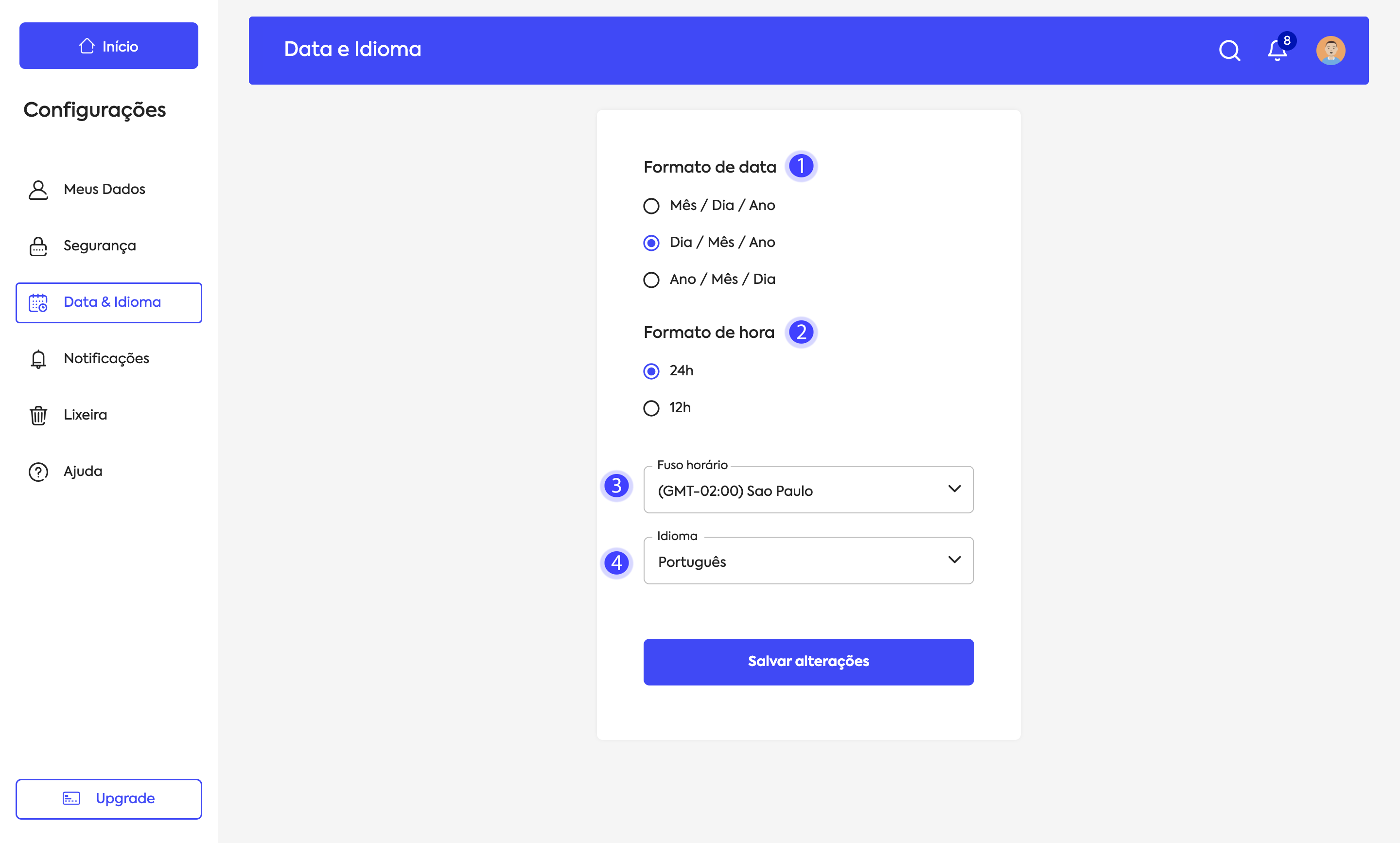 Acesse suas configurações de usuário e selecione Data & idioma no menu lateral para personalizar: