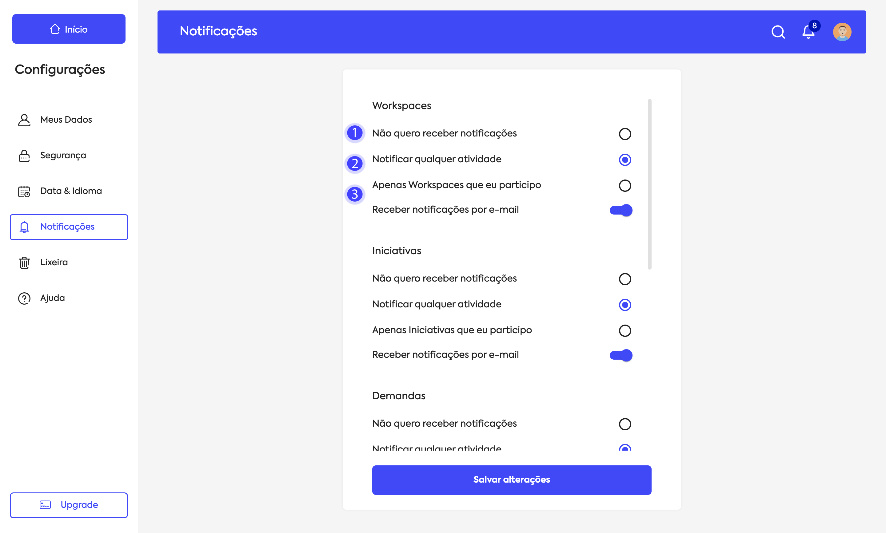 Apenas de Workspaces, Iniciativas ou Demandas que eu participo.