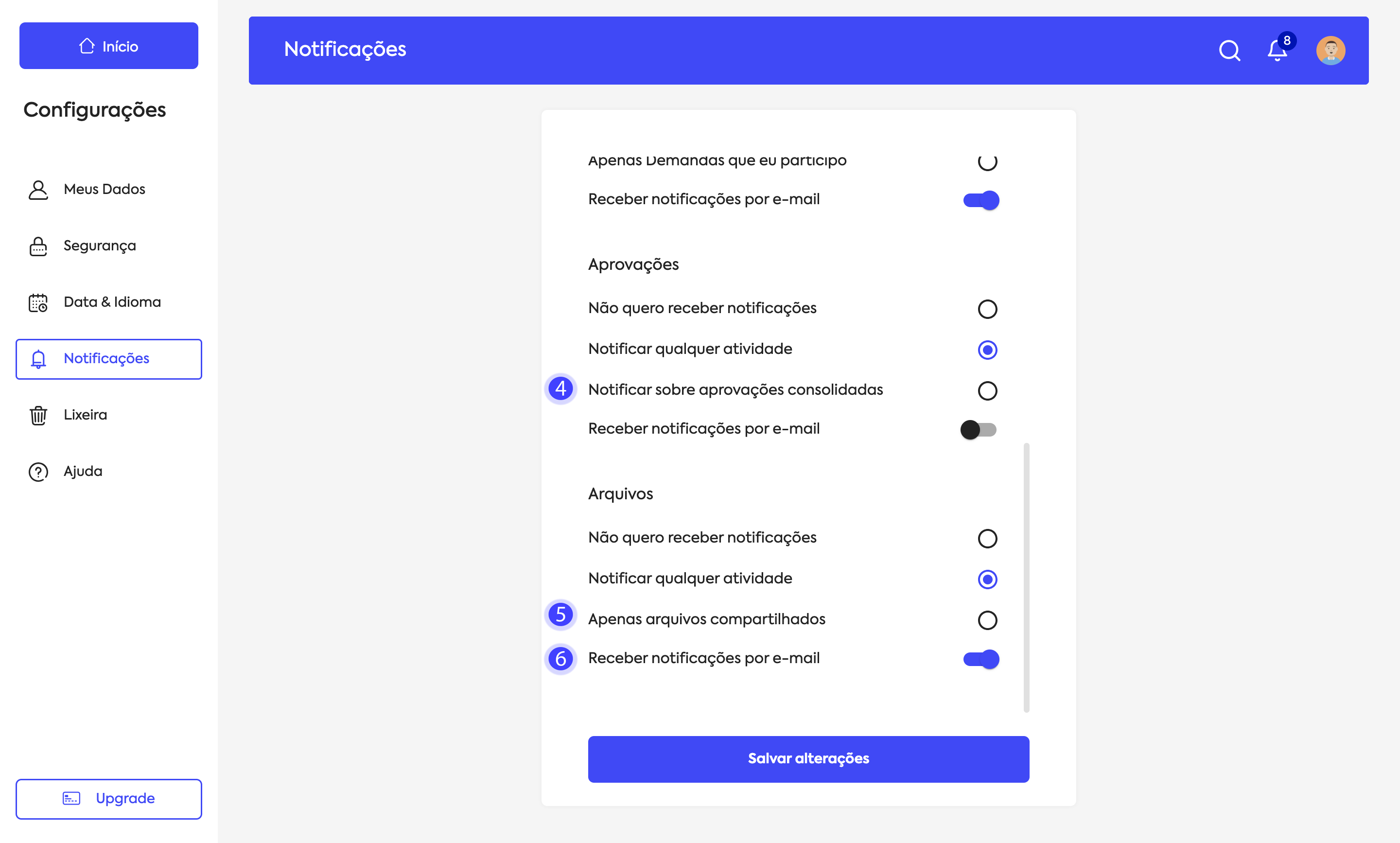 Em configurações de usuário, selecione Notificações em seu menu lateral e configure suas preferências de notificação. As opções de notificação são definidas por componente e você pode definir quais notificações deseja receber e quais silenciar em cada um de forma individual.