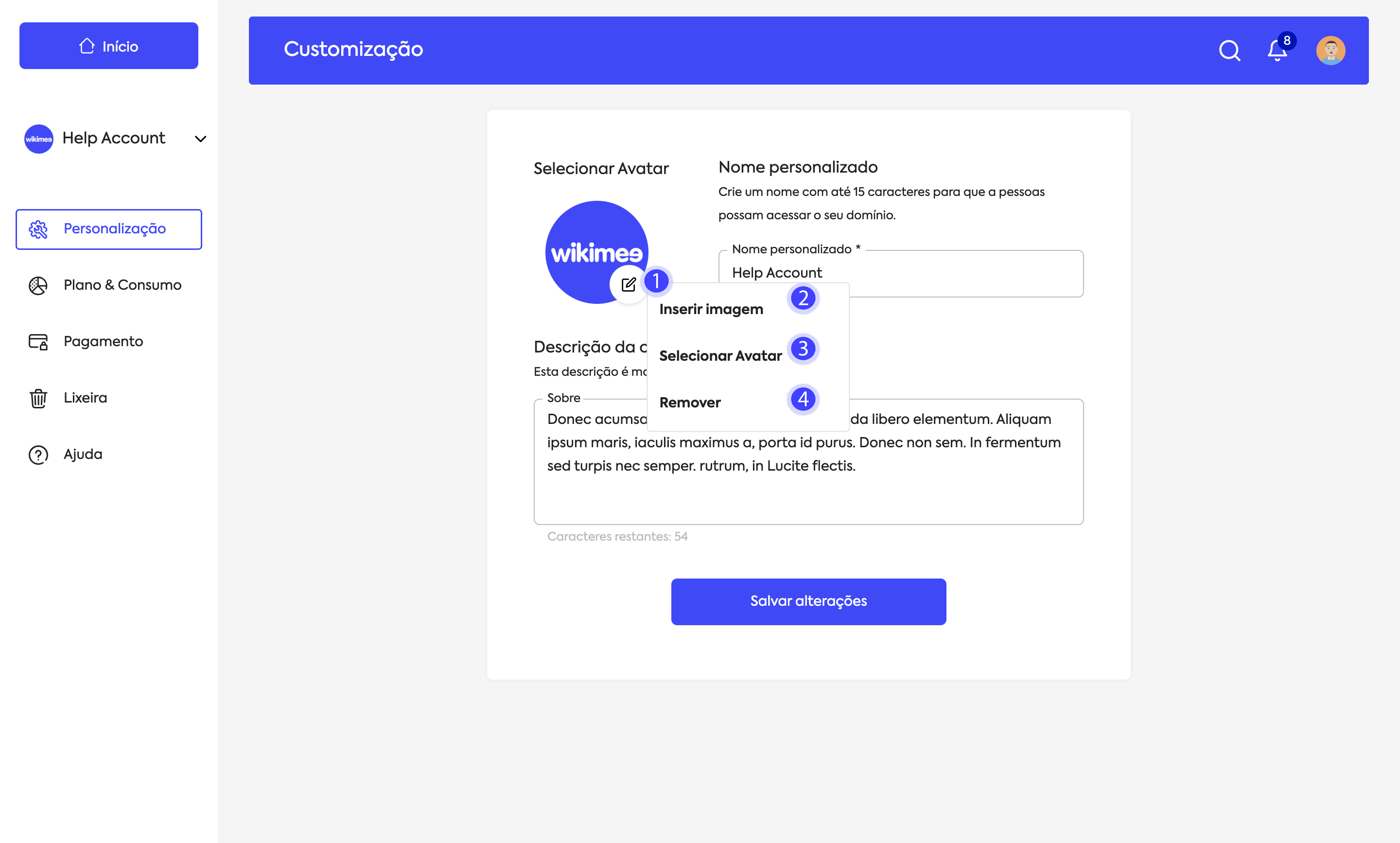 Acesse as configurações de conta e clique em Personalização no menu lateral para configurar a identidade visual de sua conta.