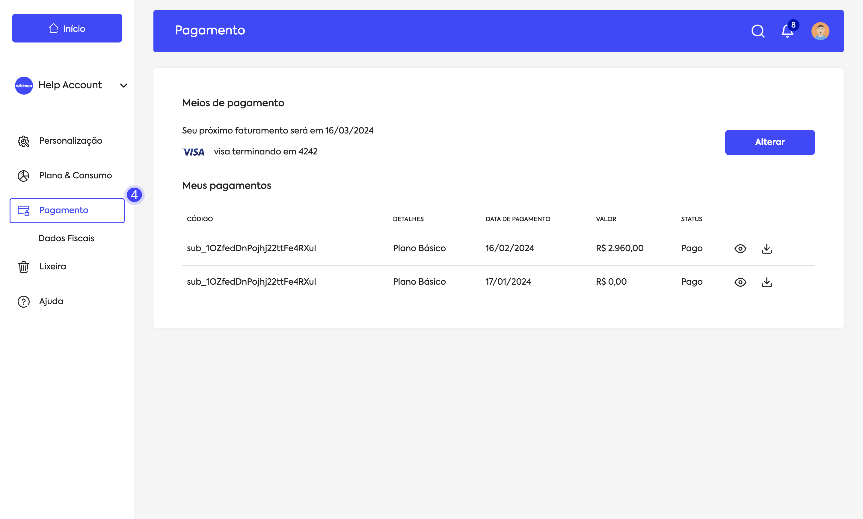 Acesse as configurações de conta e selecione Pagamento no menu lateral para visualizar a forma de pagamento cadastrada, a data do próximo faturamento, alterar o método de pagamento e visualizar os pagamentos realizados.