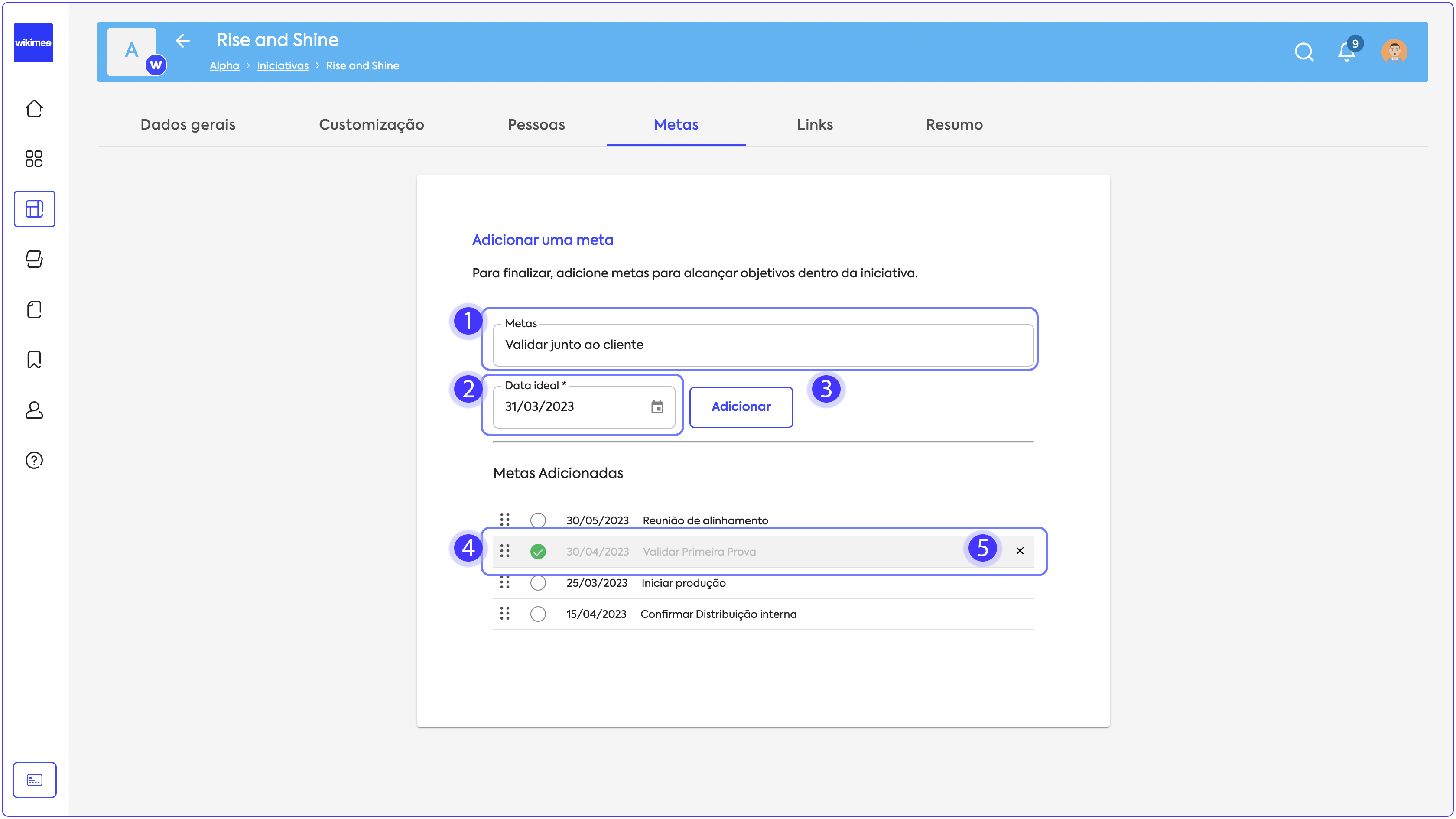 | Na adição de metas, informe objetivos a serem alcançados, forneça uma data ideal de conclusão de meta e clique em Adicionar. |