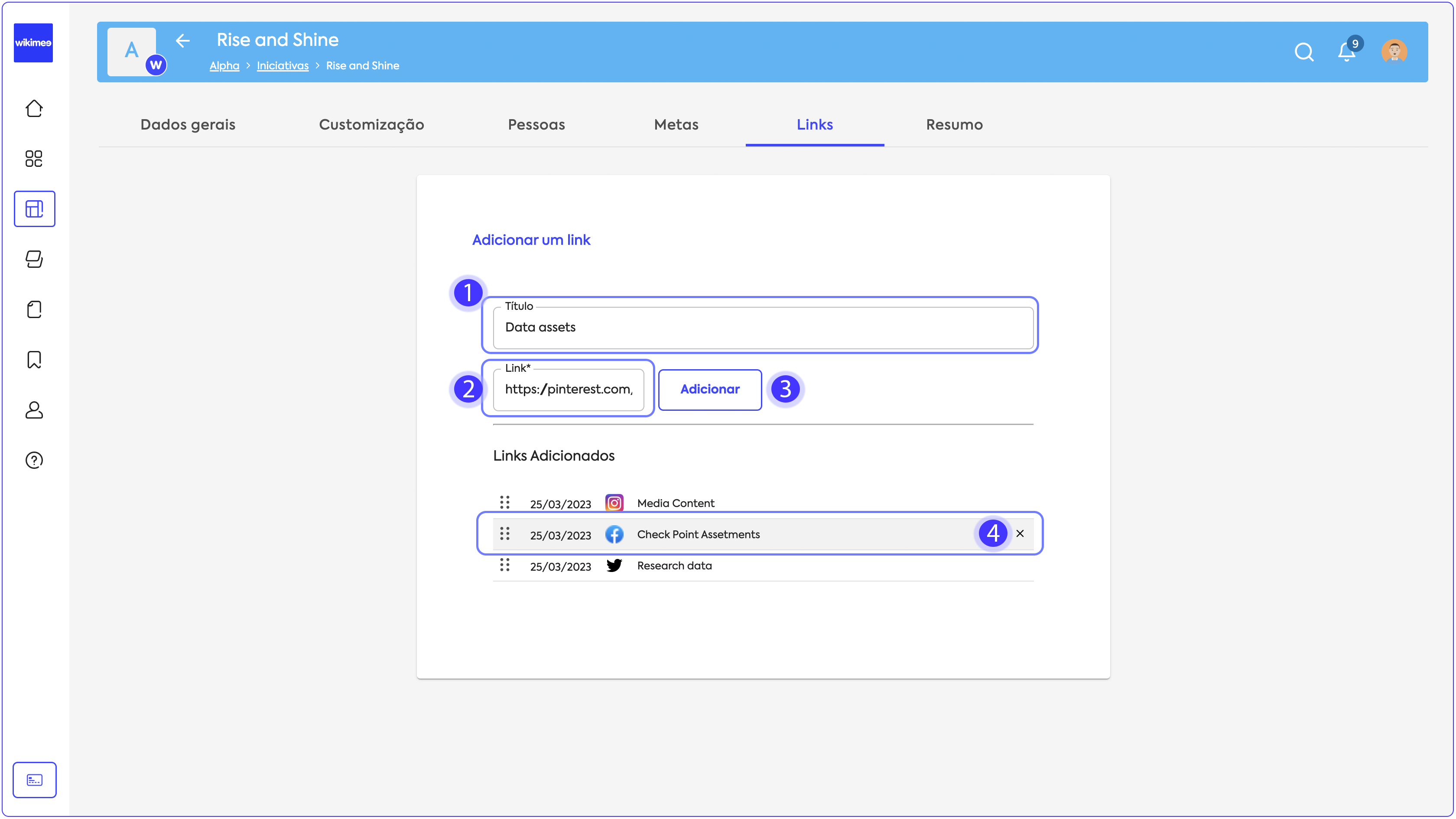 Dica: Clique nos botões posicionados à esquerda das metas e links, para movê-los verticalmente e reordená-los.
