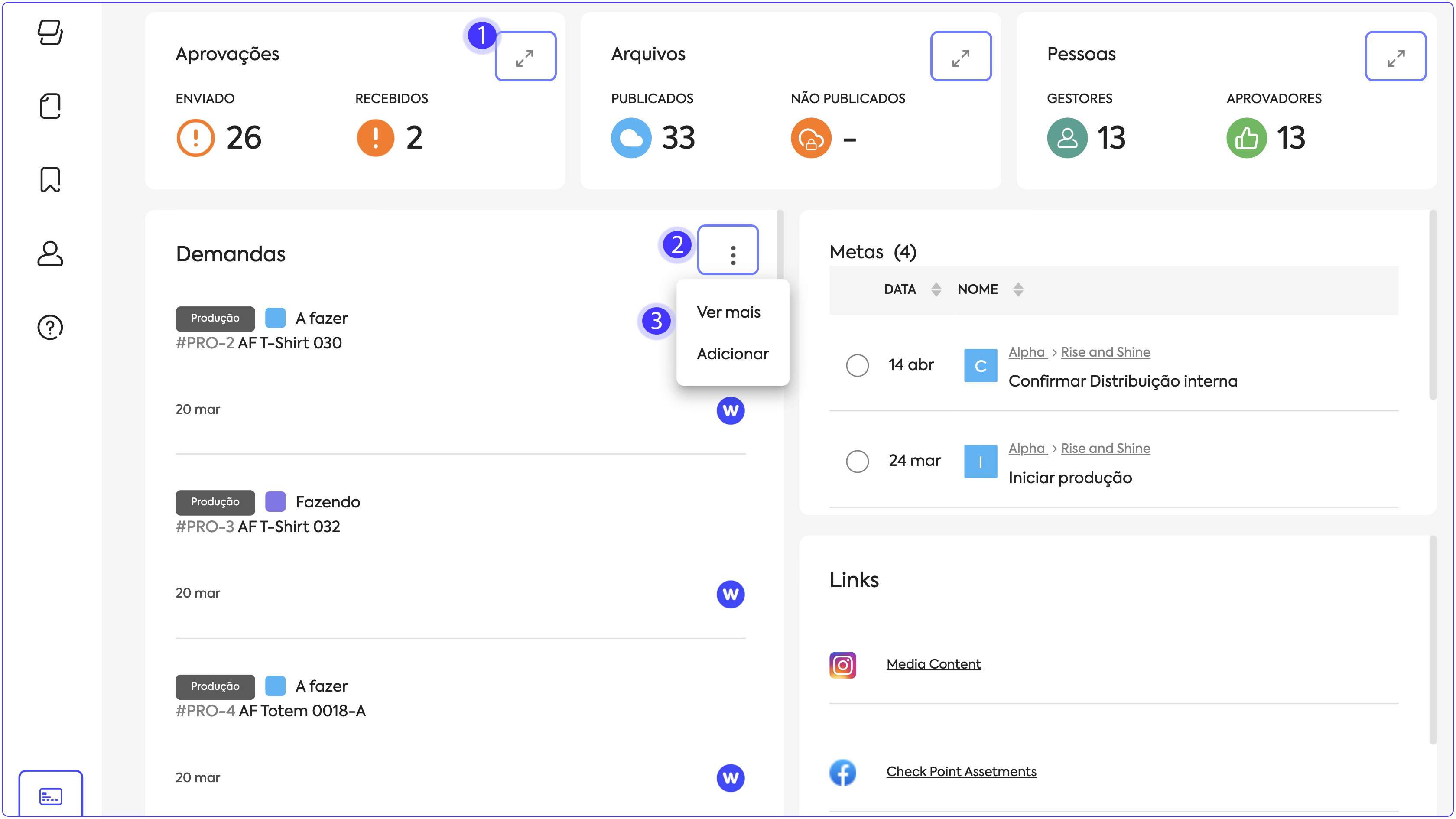 | Clique no botão localizado à direita dos quadros de aprovações, arquivos ou pessoas. | |