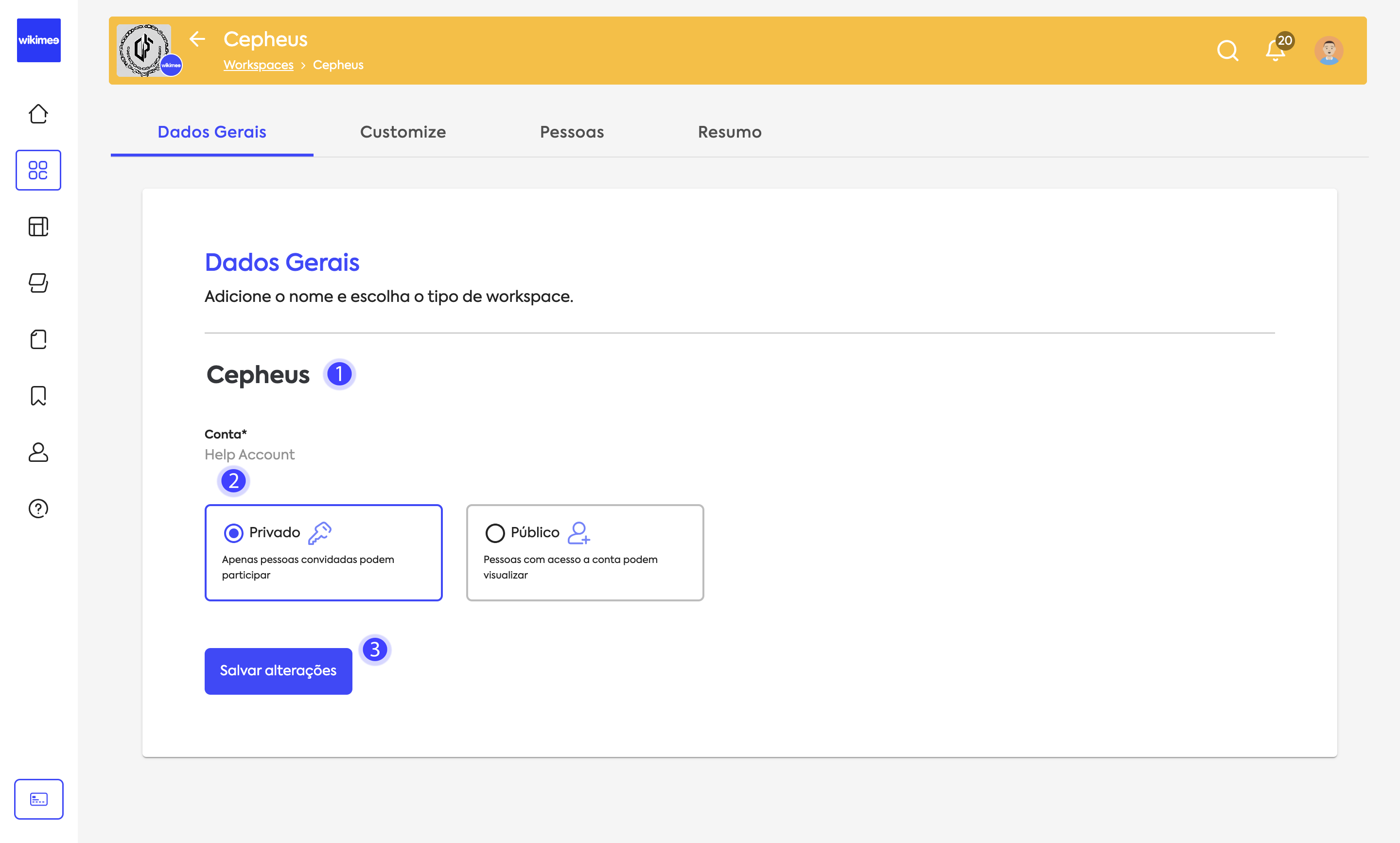 Delimite o acesso ao workspace e edite seu nome em Dados gerais: