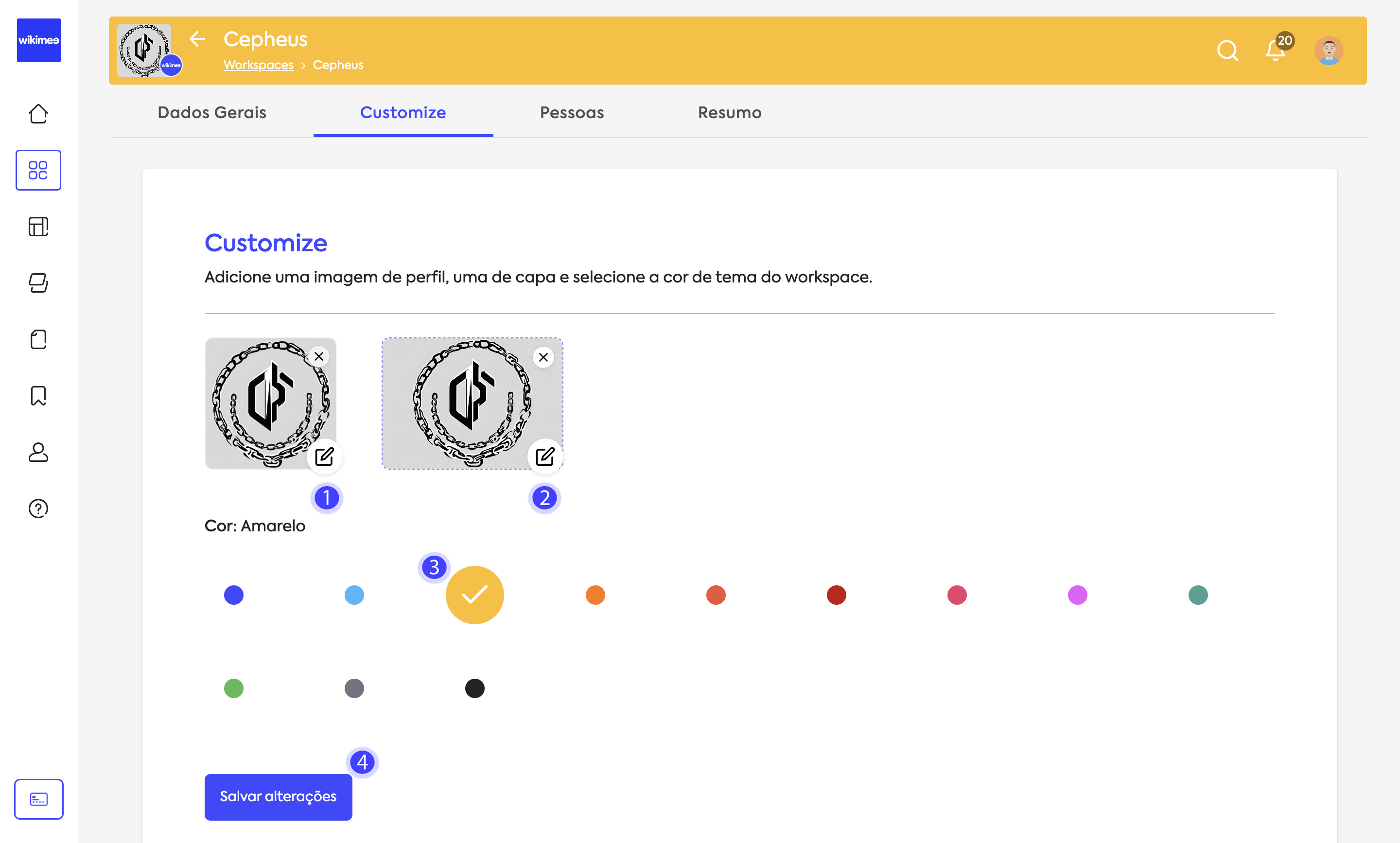 | Personalize o workspace com imagem de perfil, capa e escolha uma cor. | |