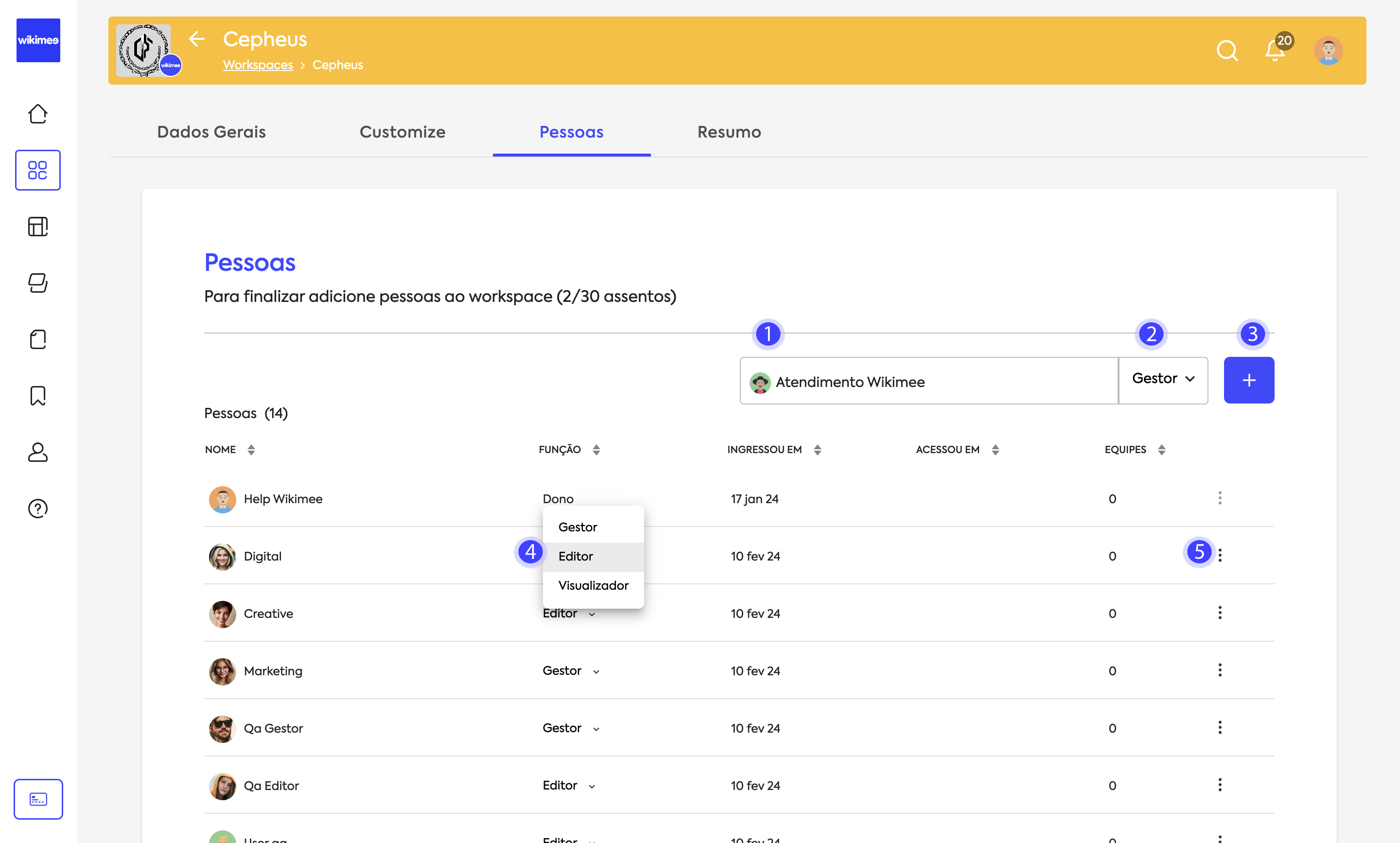 | Para alterar uma função de acesso, clique no seletor de função da pessoa. | |||