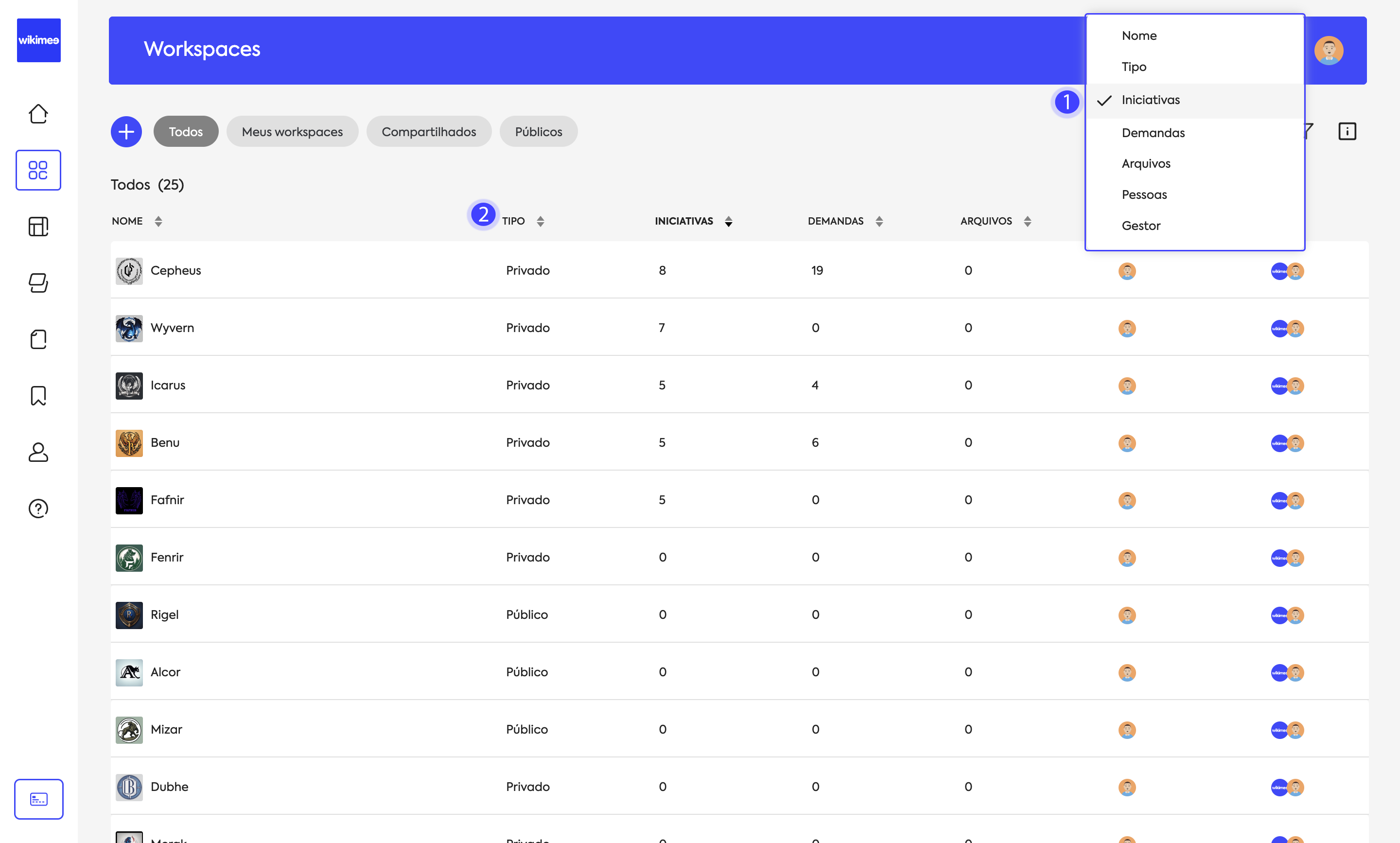 • Pessoas - Ordene pela quantidade de pessoas relacionadas a cada workspace.