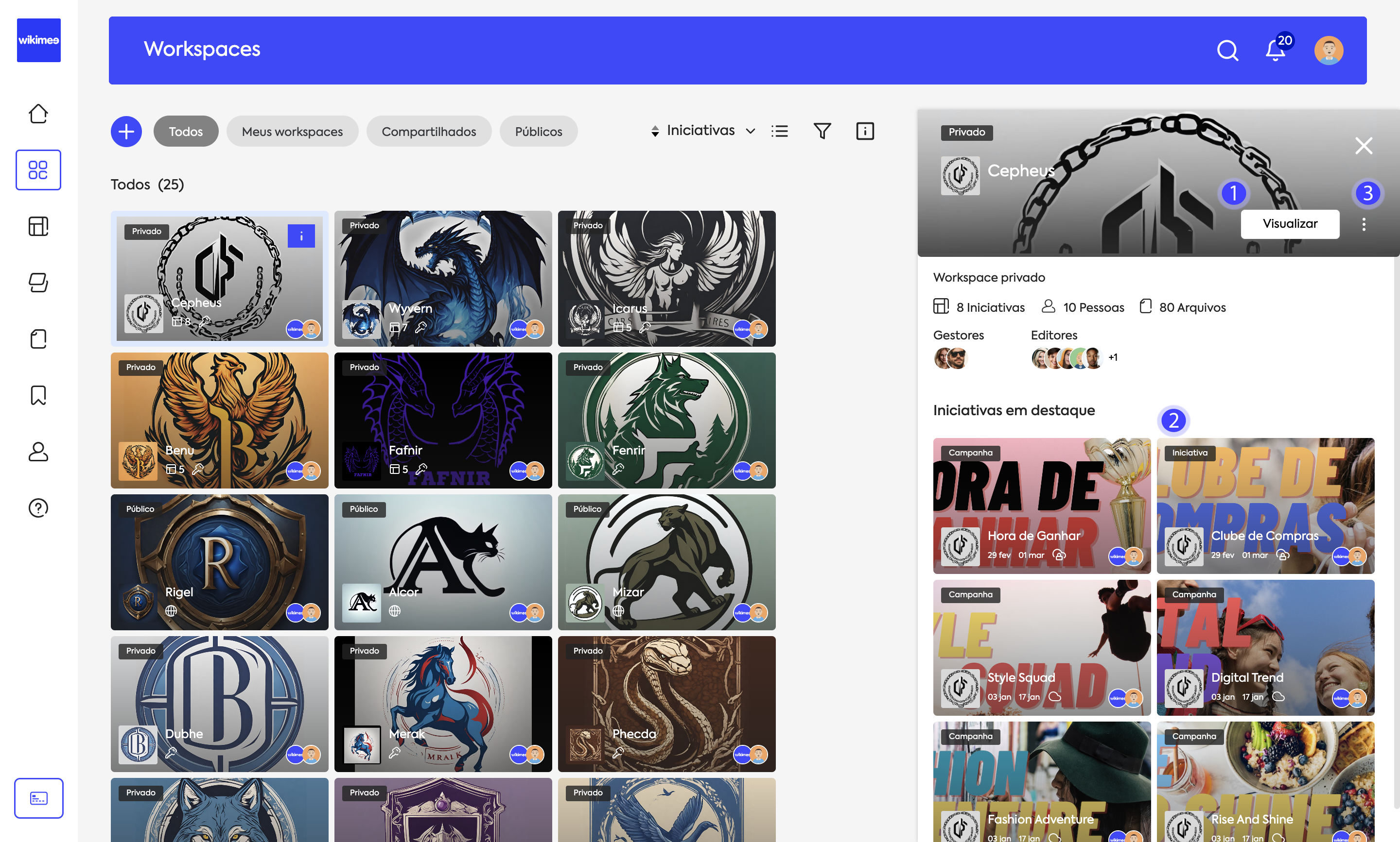 Com o botão de informações, é possível visualizar de maneira prévia: As quantidades de iniciativas, pessoas e arquivos do workspace, os gestores e editores, além das iniciativas em destaque.