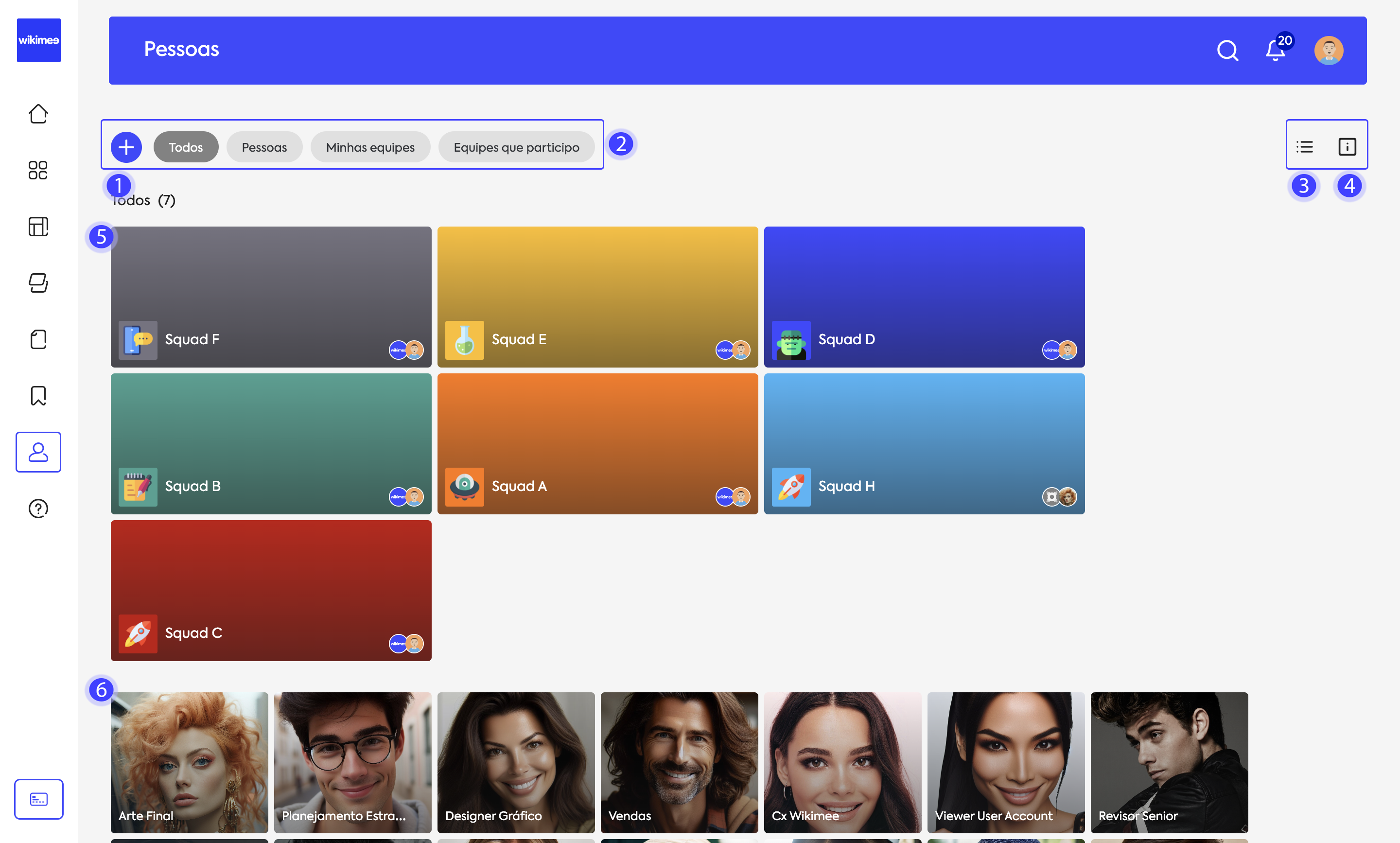 2 Os filtros de exibição de equipes e pessoas.