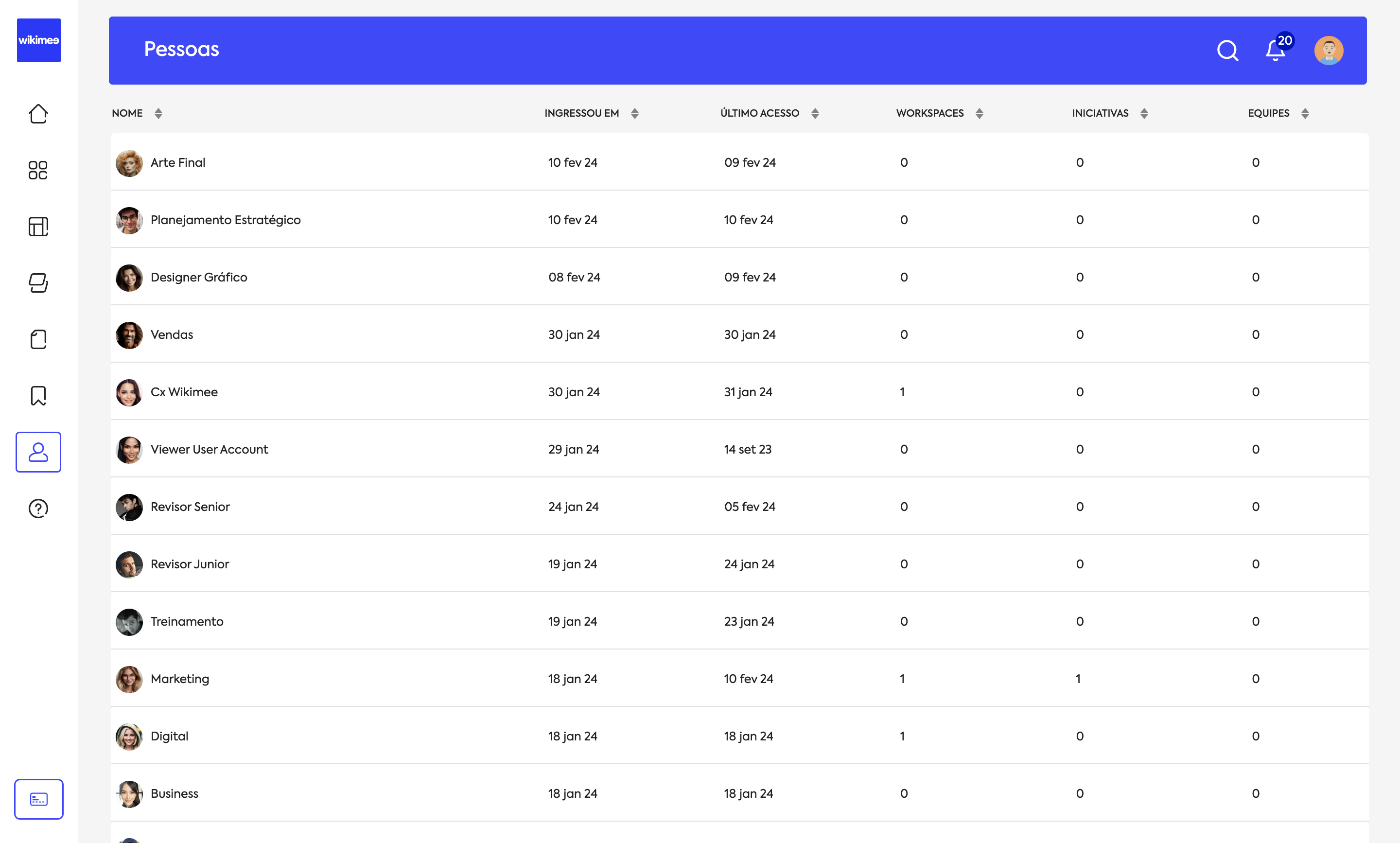 Ao acessar Pessoas na barra lateral, você terá acesso à todas as pessoas e equipes relacionados à sua conta pessoal ou corporativa. Um usuário pode visualizar as equipes em que ele está envolvido como participante e consultar as demandas com suas respectivas aprovações, iniciativas, cronogramas e workspaces da equipe.