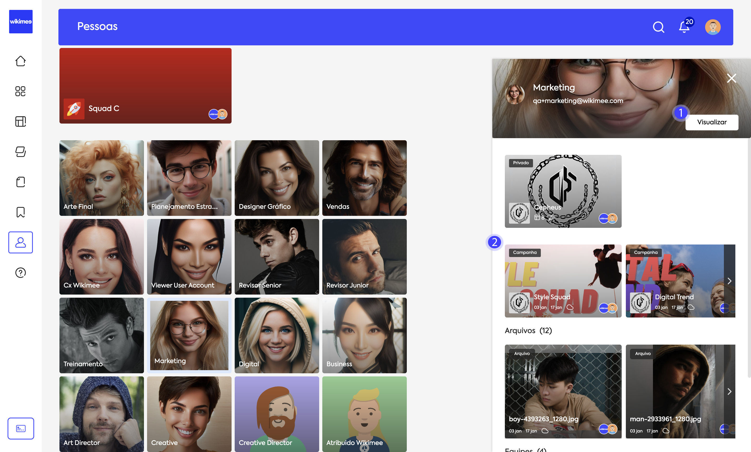 Para visualizar previamente as informações gerais, workspaces, iniciativas e arquivos de uma pessoa ou equipe, sem perder sua visualização da navegação da seção pessoas, utilize o botão de informações.